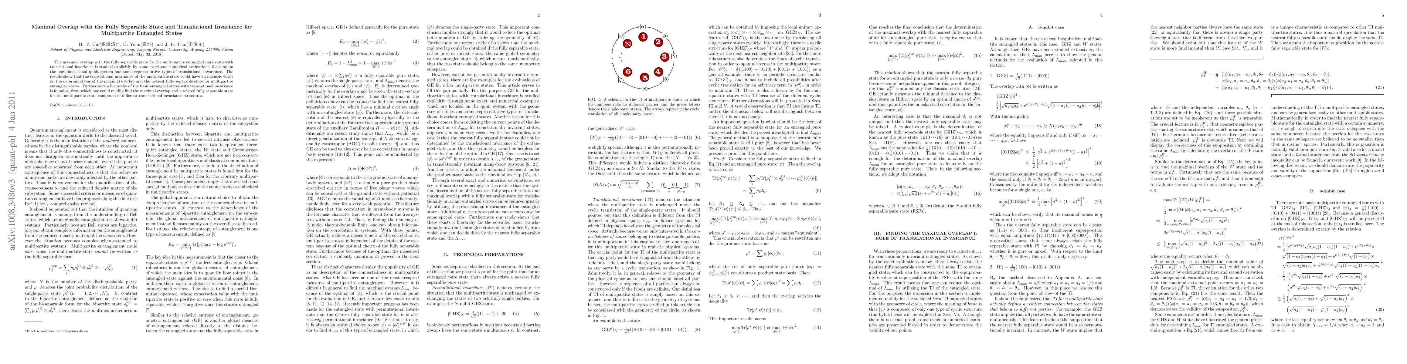 This paper investigates the maximal overlap between multipartite entangled states and fully separable states, focusing on systems with translational invariance. The study reveals that translational invariance affects the determination of maximal overlap and identifies a hierarchy of entangled states with translational invariance, facilitating the identification of the nearest separable state.