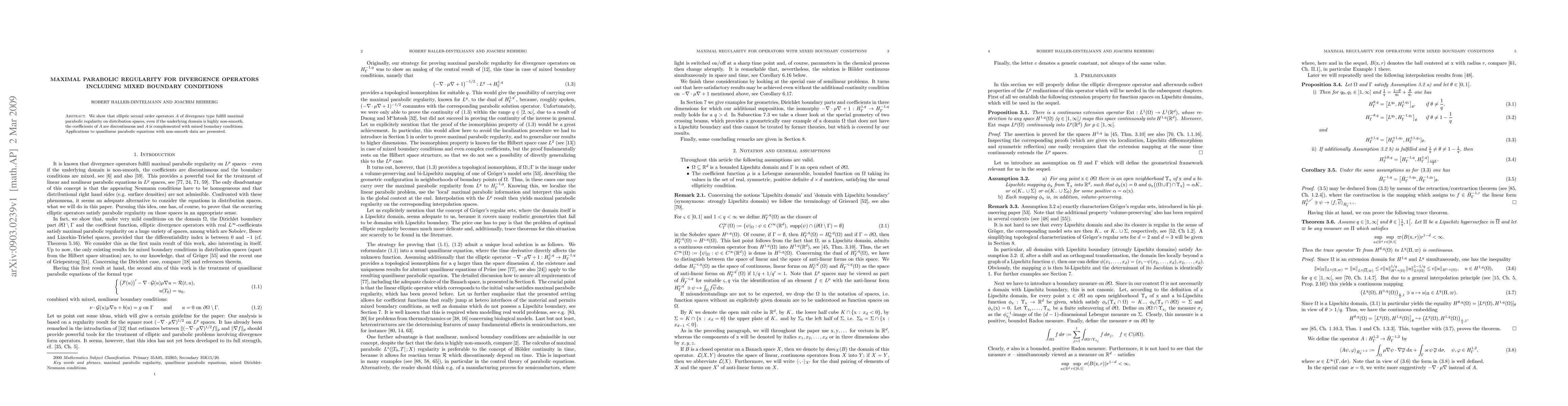 Summary: This paper demonstrates maximal parabolic regularity for divergence-type elliptic operators under mixed boundary conditions, even with discontinuous coefficients and non-smooth domains, and applies these findings to quasilinear parabolic equations.