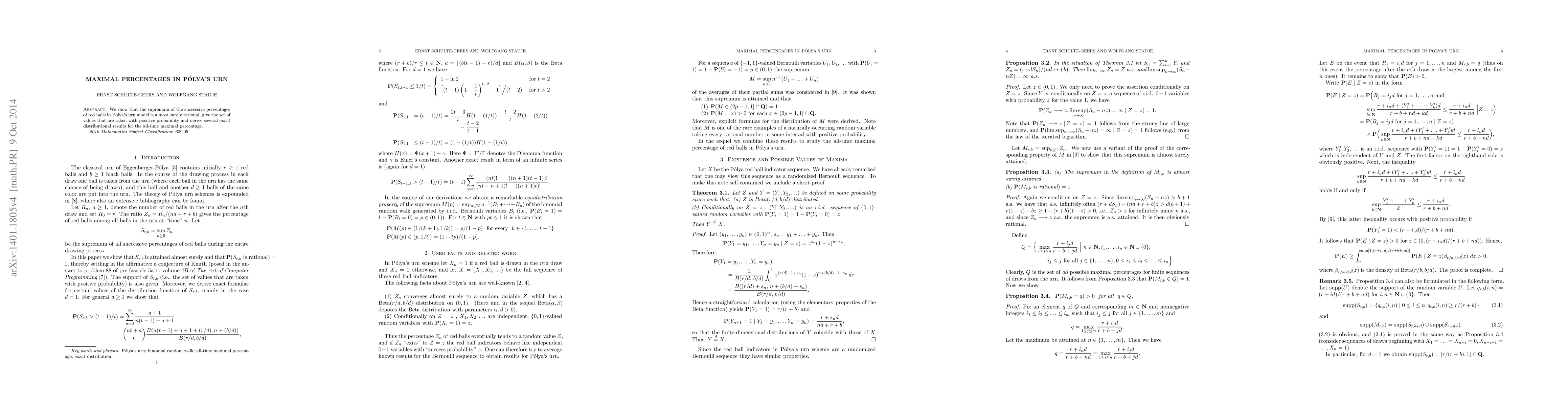 We show that the supremum of the successive percentages of red balls in P\'olya's urn model is almost surely rational, give the set of values that are taken with positive probability and derive several exact distributional results for the all-time maximal percentage.