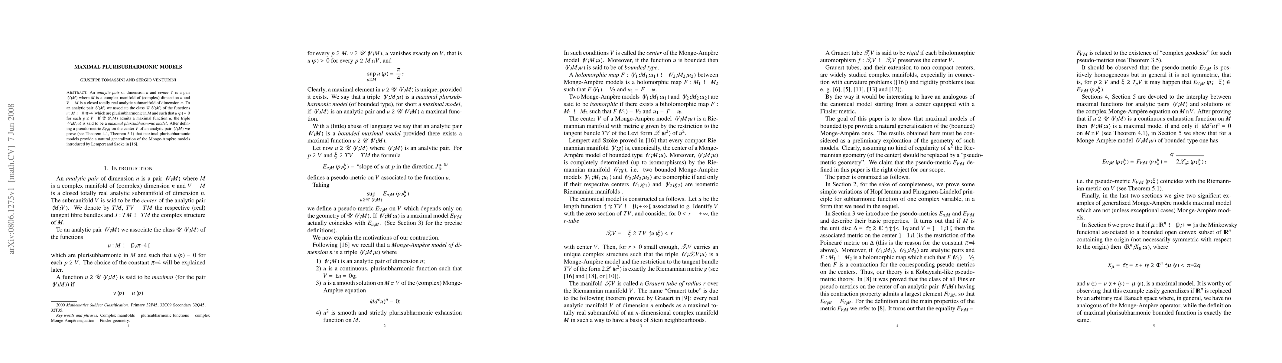 An analytic pair of dimension n and center V is a pair (V, M) where M is a complex manifold of (complex) dimension n and V is a closed totally real analytic submanifold of dimension n. To an analytic pair (V, M) we associate the class of the functions u from M to a positive bounded interval which are plurisubharmonic in M and such that u(p) = 0 for each p in V. If the class admits a maximal function u, the triple (V, M, u) is said to be a maximal plurisubharmonic model. After defining a pseudo-metric E(V,M) on the center V of an analytic pair (V, M) we prove (see Theorem 4.1, Theorem 5.1) that maximal plurisubharmonic models provide a natural generalization of the Monge-Ampere models introduced by Lempert and Szoke in [16].