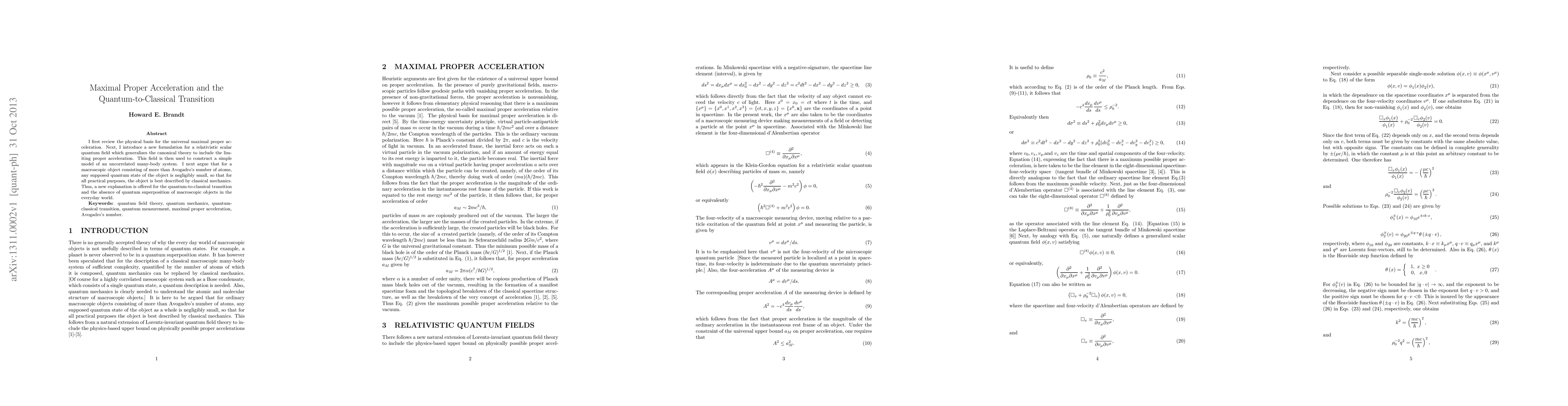 I first review the physical basis for the universal maximal proper acceleration. Next, I introduce a new formulation for a relativistic scalar quantum field which generalizes the canonical theory to include the limiting proper acceleration. This field is then used to construct a simple model of an uncorrelated many-body system. I next argue that for a macroscopic object consisting of more than Avogadro's number of atoms, any supposed quantum state of the object is negligibly small, so that for all practical purposes, the object is best described by classical mechanics. Thus, a new explanation is offered for the quantum-to-classical transition and the absence of quantum superposition of macroscopic objects in the everyday world.