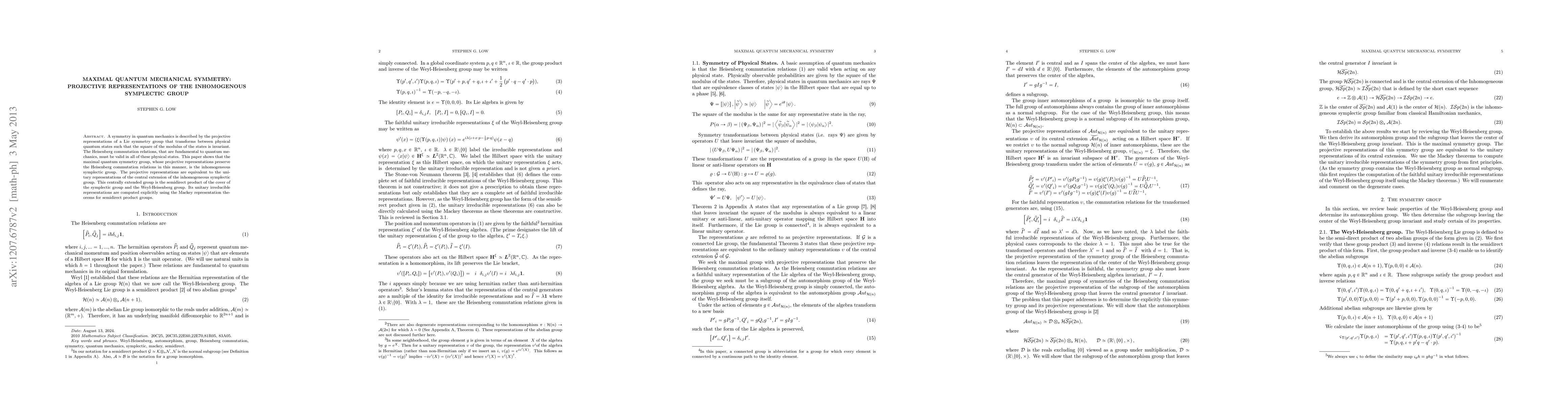A symmetry in quantum mechanics is described by the projective representations of a Lie symmetry group that transforms between physical quantum states such that the square of the modulus of the states is invariant. The Heisenberg commutation relations, that are fundamental to quantum mechanics, must be valid in all of these physical states. This paper shows that the maximal quantum symmetry group, whose projective representations preserve the Heisenberg commutation relations in this manner, is the inhomogeneous symplectic group. The projective representations are equivalent to the unitary representations of the central extension of the inhomogeneous symplectic group. This centrally extended group is the semidirect product of the cover of the symplectic group and the Weyl-Heisenberg group. Its unitary irreducible representations are computed explicitly using the Mackey representation theorems for semidirect product groups.