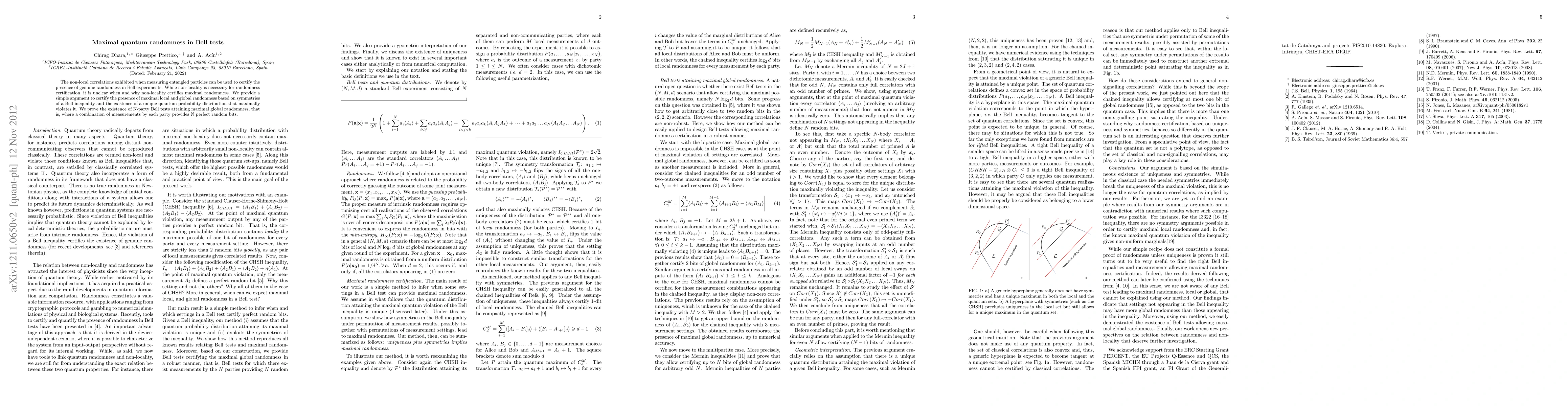 This paper argues that maximal quantum randomness in Bell tests can be certified through non-local correlations in entangled particles, using symmetries of Bell inequalities and a unique quantum probability distribution. It proves the existence of N-party Bell tests that yield N perfect random bits.