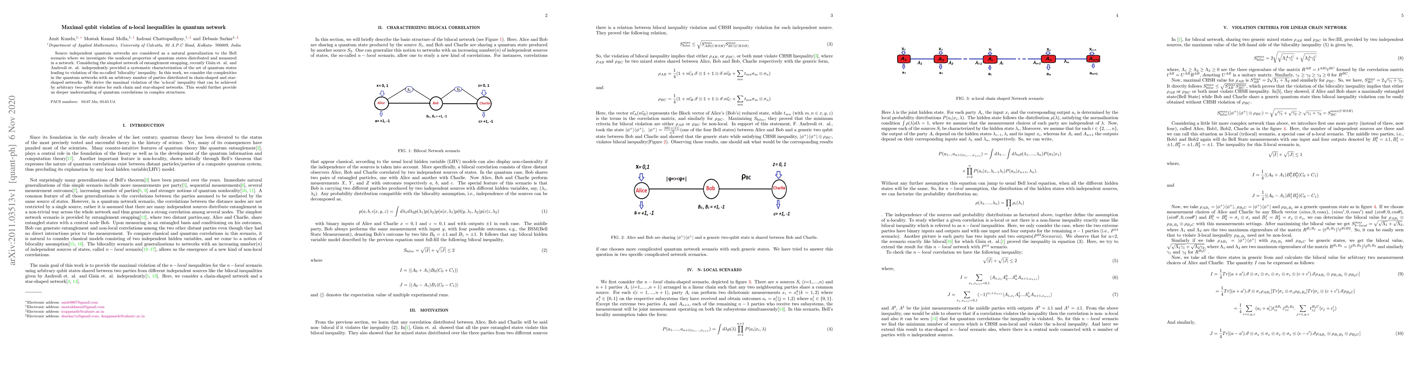 Source independent quantum networks are considered as a natural generalization to the Bell scenario where we investigate the nonlocal properties of quantum states distributed and measured in a network. Considering the simplest network of entanglement swapping, recently Gisin et. al. and Andreoli et. al. independently provided a systematic characterization of the set of quantum states leading to violation of the so-called 'bilocality' inequality. In this work, we consider the complexities in the quantum networks with an arbitrary number of parties distributed in chain-shaped and star-shaped networks. We derive the maximal violation of the 'n-local' inequality that can be achieved by arbitrary two-qubit states for such chain and star-shaped networks. This would further provide us deeper understanding of quantum correlations in complex structures.
