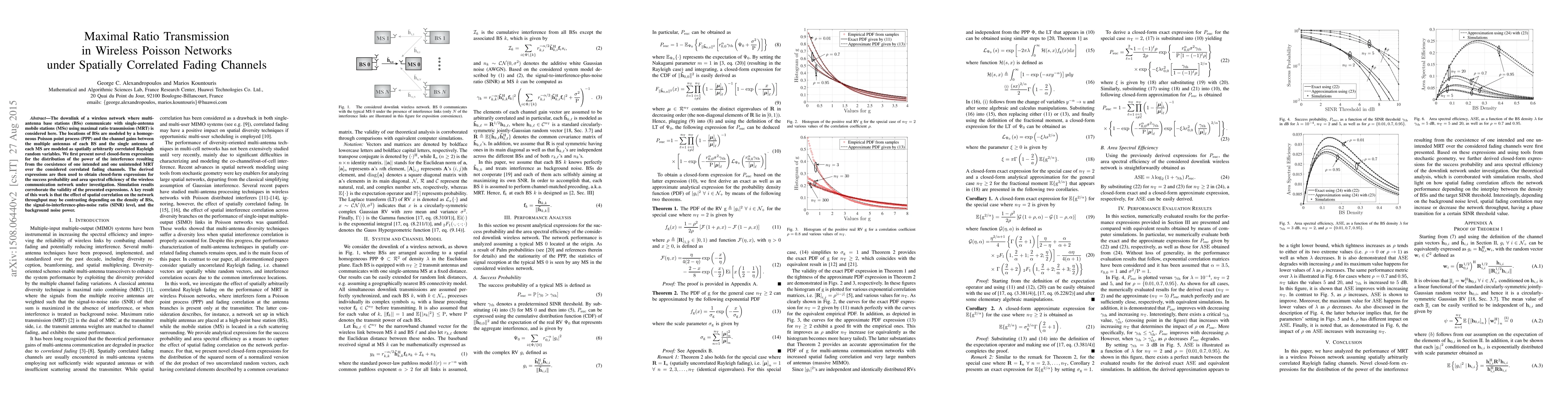 The downlink of a wireless network where multi-antenna base stations (BSs) communicate with single-antenna mobile stations (MSs) using maximal ratio transmission (MRT) is considered here. The locations of BSs are modeled by a homogeneous Poisson point process (PPP) and the channel gains between the multiple antennas of each BS and the single antenna of each MS are modeled as spatially arbitrarily correlated Rayleigh random variables. We first present novel closed-form expressions for the distribution of the power of the interference resulting from the coexistence of one intended and one unintended MRT over the considered correlated fading channels. The derived expressions are then used to obtain closed-form expressions for the success probability and area spectral efficiency of the wireless communication network under investigation. Simulation results corroborate the validity of the presented expressions. A key result of this work is that the effect of spatial correlation on the network throughput may be contrasting depending on the density of BSs, the signal-to-interference-plus-noise ratio (SINR) level, and the background noise power.