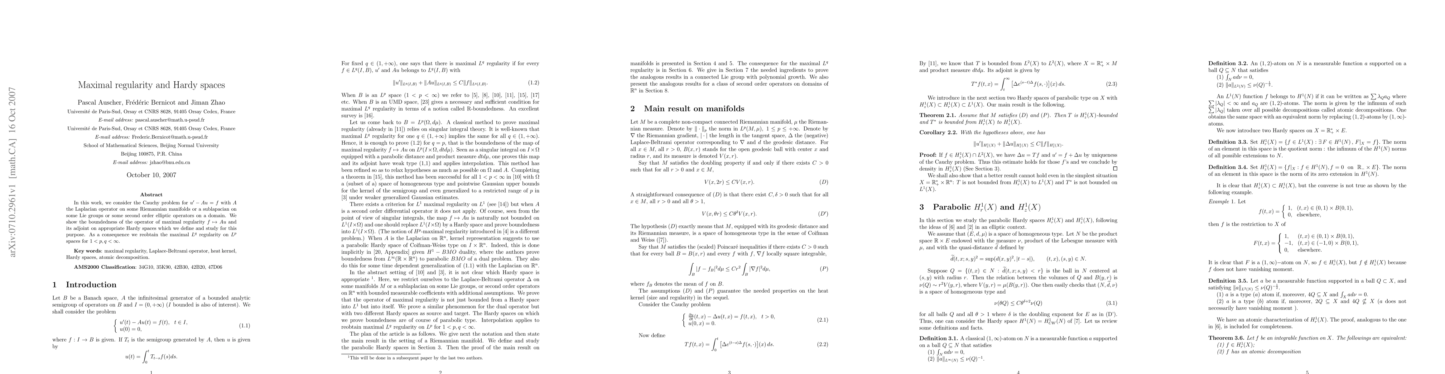 In this work, we consider the Cauchy problem for $u' - Au = f$ with $A$ the Laplacian operator on some Riemannian manifolds or a sublapacian on some Lie groups or some second order elliptic operators on a domain. We show the boundedness of the operator of maximal regularity $f\mapsto Au$ and its adjoint on appropriate Hardy spaces which we define and study for this purpose. As a consequence we reobtain the maximal $L^q$ regularity on $L^p$ spaces for $p,q$ between 1 and $\infty$.