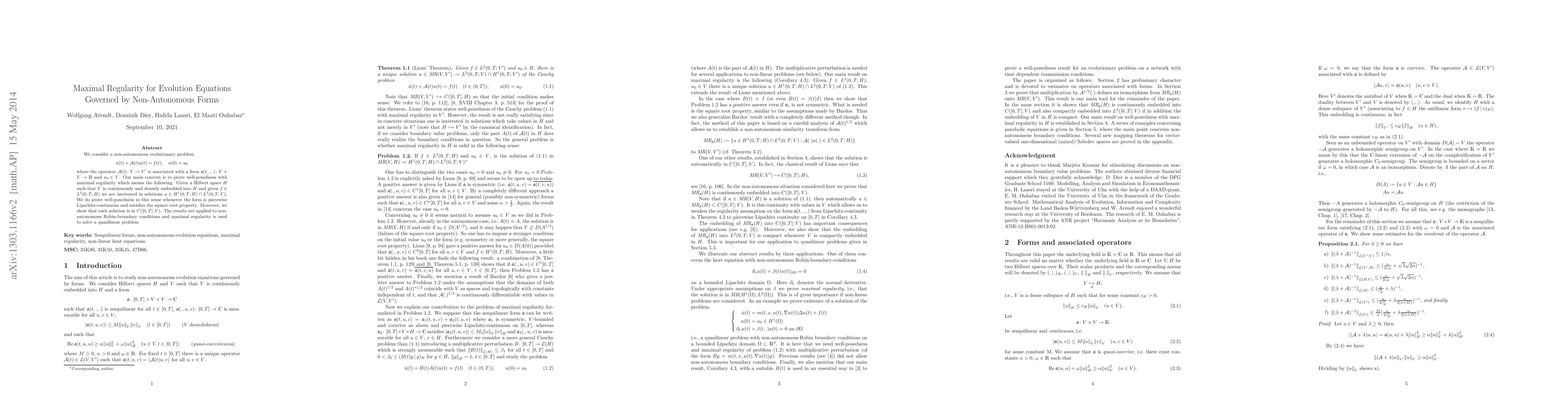 \begin{abstract}\label{abstract} We consider a non-autonomous evolutionary problem \[ \dot{u} (t)+\A(t)u(t)=f(t), \quad u(0)=u_0 \] where the operator $\A(t):V\to V^\prime$ is associated with a form $\fra(t,.,.):V\times V \to \R$ and $u_0\in V$. Our main concern is to prove well-posedness with maximal regularity which means the following. Given a Hilbert space $H$ such that $V$ is continuously and densely embedded into $H$ and given $f\in L^2(0,T;H)$ we are interested in solutions $u \in H^1(0,T;H)\cap L^2(0,T;V)$. We do prove well-posedness in this sense whenever the form is piecewise Lipschitz-continuous and symmetric. Moreover, we show that each solution is in $C([0,T];V)$. We apply the results to non-autonomous Robin-boundary conditions and also use maximal regularity to solve a quasilinear problem.