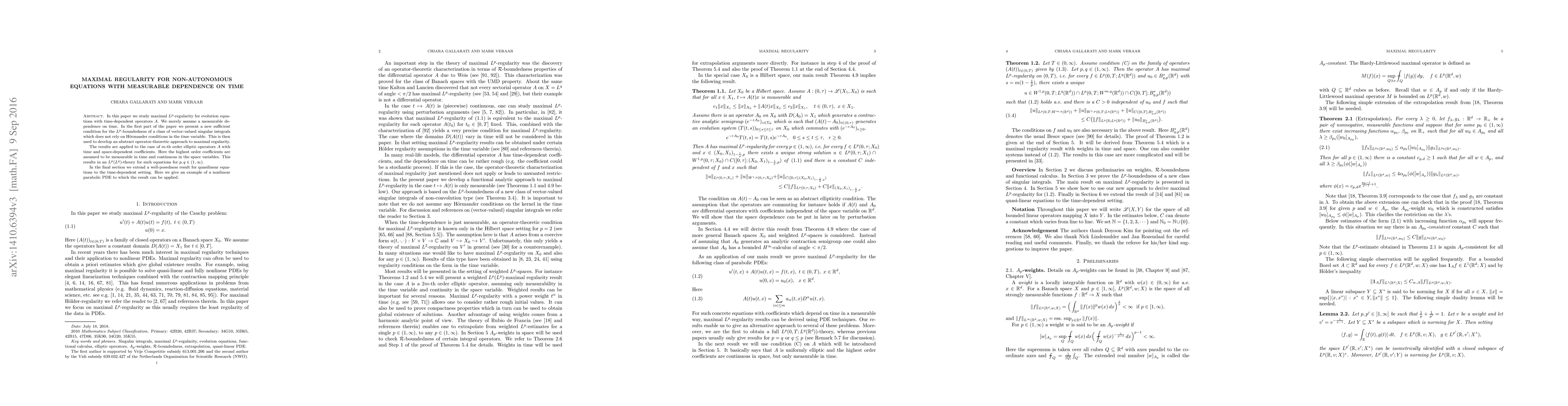 This paper investigates maximal $L^p$-regularity for evolution equations with time-dependent operators assuming only measurable time dependence. It introduces a new condition for $L^p$-boundedness of vector-valued singular integrals, leading to an abstract operator-theoretic approach for maximal regularity, applied to time-dependent elliptic operators and quasilinear PDEs.