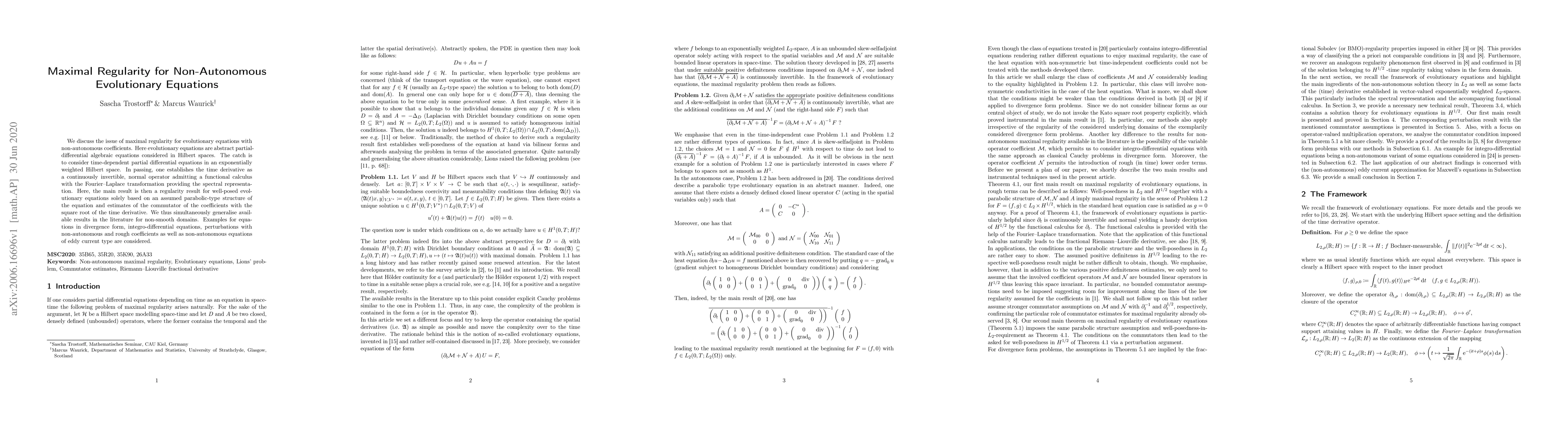 We discuss the issue of maximal regularity for evolutionary equations with non-autonomous coefficients. Here evolutionary equations are abstract partial-differential algebraic equations considered in Hilbert spaces. The catch is to consider time-dependent partial differential equations in an exponentially weighted Hilbert space. In passing, one establishes the time derivative as a continuously invertible, normal operator admitting a functional calculus with the Fourier--Laplace transformation providing the spectral representation. Here, the main result is then a regularity result for well-posed evolutionary equations solely based on an assumed parabolic-type structure of the equation and estimates of the commutator of the coefficients with the square root of the time derivative. We thus simultaneously generalise available results in the literature for non-smooth domains. Examples for equations in divergence form, integro-differential equations, perturbations with non-autonomous and rough coefficients as well as non-autonomous equations of eddy current type are considered.