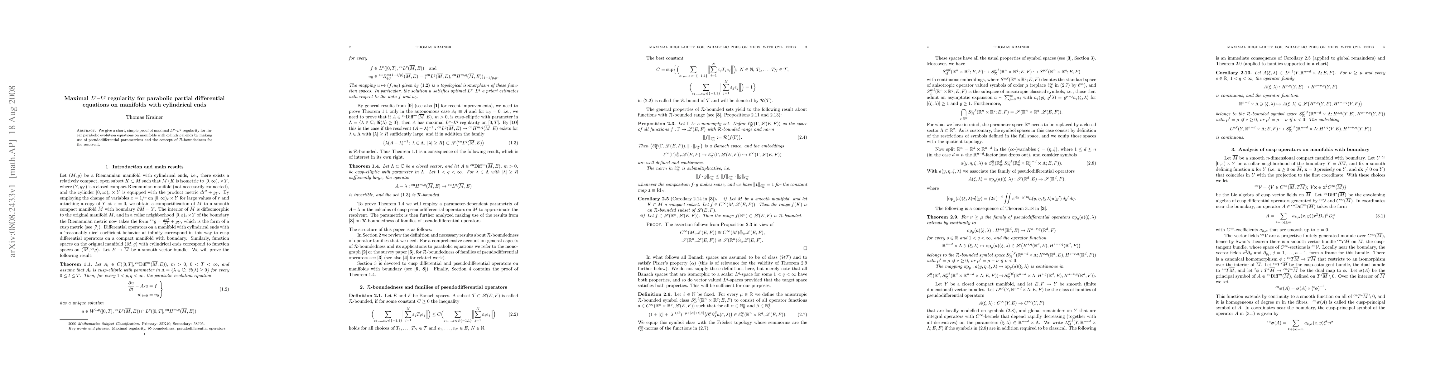Summary: This paper presents a straightforward proof of maximal regularity for linear parabolic evolution equations on manifolds with cylindrical ends, utilizing pseudodifferential parametrices and the R-boundedness concept for the resolvent. The approach simplifies the analysis of these complex geometries.