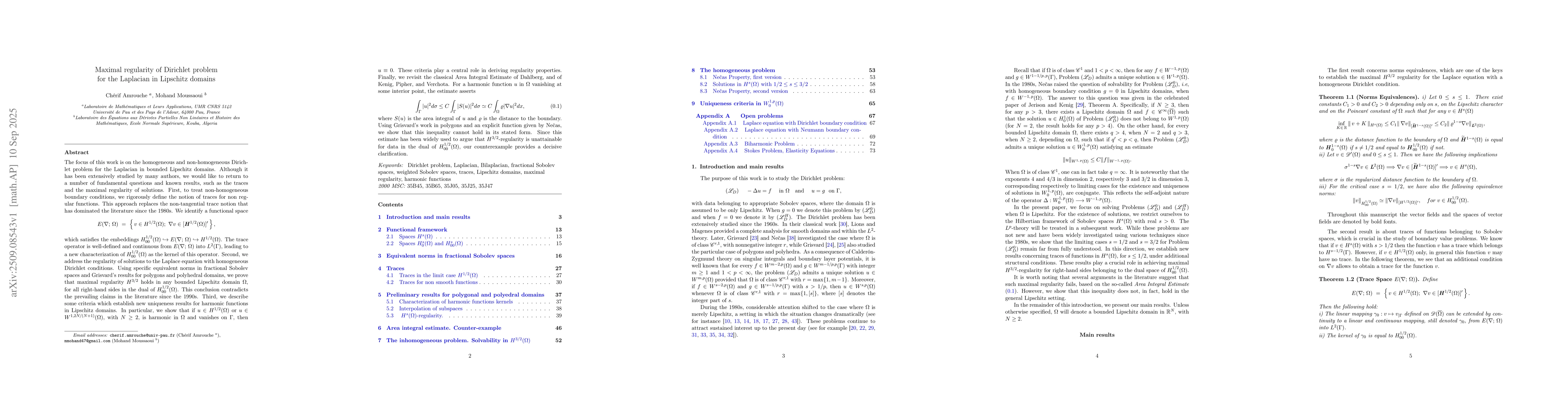 The focus of this work is on the homogeneous and non-homogeneous Dirichlet problem for the Laplacian in bounded Lipschitz domains (BLD). Although it has been extensively studied by many authors, we would like to return to a number of fundamental questions and known results, such as the traces and the maximal regularity of solutions. First, to treat non-homogeneous boundary conditions, we rigorously define the notion of traces for non regular functions. This approach replaces the non-tangential trace notion that has dominated the literature since the 1980s. We identify a functional space E = \{v\in H^{1/2}(\Omega);\nabla v\in [H^1/2(\Omega)]'\} for which the trace operator is continuous from $E$ into $L^2(\Gamma)$. Second, we address the regularity of solutions to the Laplace equation with homogeneous Dirichlet conditions. Using specific equivalent norms in fractional Sobolev spaces and Grisvard's results for polygons and polyhedral domains, we prove that maximal regularity $H^{3/2}$ holds in any BLD $\Omega$, for all right-hand sides in the dual of $H^{1/2}_{00}(\Omega)$. This conclusion contradicts the prevailing claims in the literature since the 1990s. Third, we describe some criteria which establish new uniqueness results for harmonic functions in Lipschitz domains. In particular, we show that if $u\in H^{1/2}(\Omega)$ or $u\in W^{1, 2N/(N+1)}(\Omega)$, is harmonic in $\Omega$ and vanishes on $\Gamma$, then $u= 0$. These criteria play a central role in deriving regularity properties. Finally, we revisit the classical Area Integral Estimate. Using Grisvard's work and an explicit function given by Necas, we show that this inequality cannot hold in its stated form. Since this estimate has been widely used to argue that $H^{3/2}$-regularity is unattainable for data in the dual of $H^{1/2}_{00}(\Omega)$, our counterexample provides a decisive clarification.