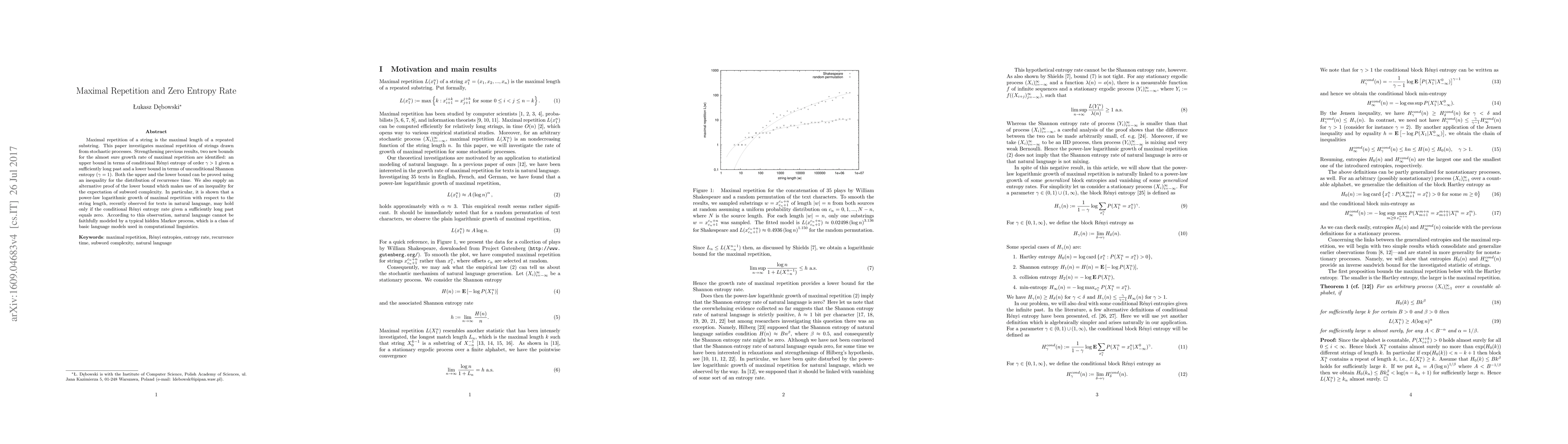 Maximal repetition of a string is the maximal length of a repeated substring. This paper investigates maximal repetition of strings drawn from stochastic processes. Strengthening previous results, two new bounds for the almost sure growth rate of maximal repetition are identified: an upper bound in terms of conditional R\'enyi entropy of order $\gamma>1$ given a sufficiently long past and a lower bound in terms of unconditional Shannon entropy ($\gamma=1$). Both the upper and the lower bound can be proved using an inequality for the distribution of recurrence time. We also supply an alternative proof of the lower bound which makes use of an inequality for the expectation of subword complexity. In particular, it is shown that a power-law logarithmic growth of maximal repetition with respect to the string length, recently observed for texts in natural language, may hold only if the conditional R\'enyi entropy rate given a sufficiently long past equals zero. According to this observation, natural language cannot be faithfully modeled by a typical hidden Markov process, which is a class of basic language models used in computational linguistics.