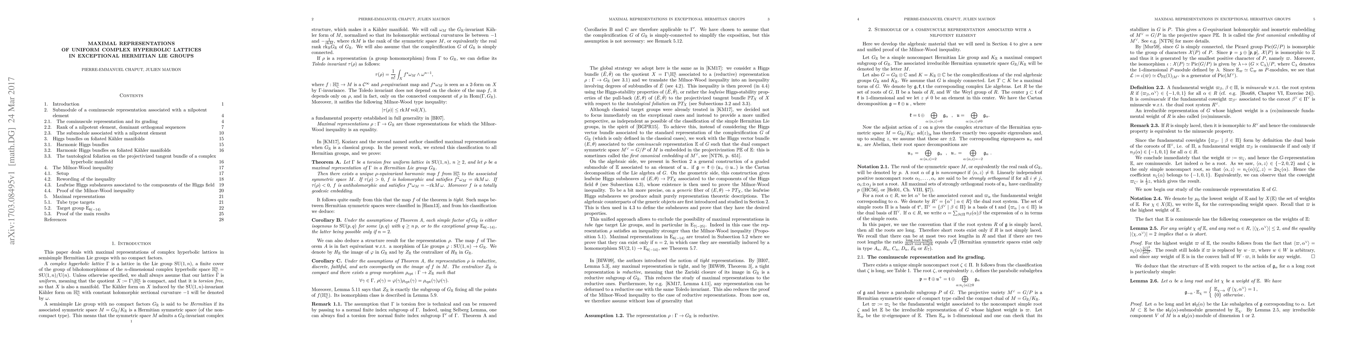 This paper completes the classification of maximal representations of uniform complex hyperbolic lattices in Hermitian Lie groups, focusing on the exceptional groups E₆ and E₇. The authors prove that such maximal representations occur only when the lattice is in SU(1,2) embedded in E₆, and describe these representations in detail.