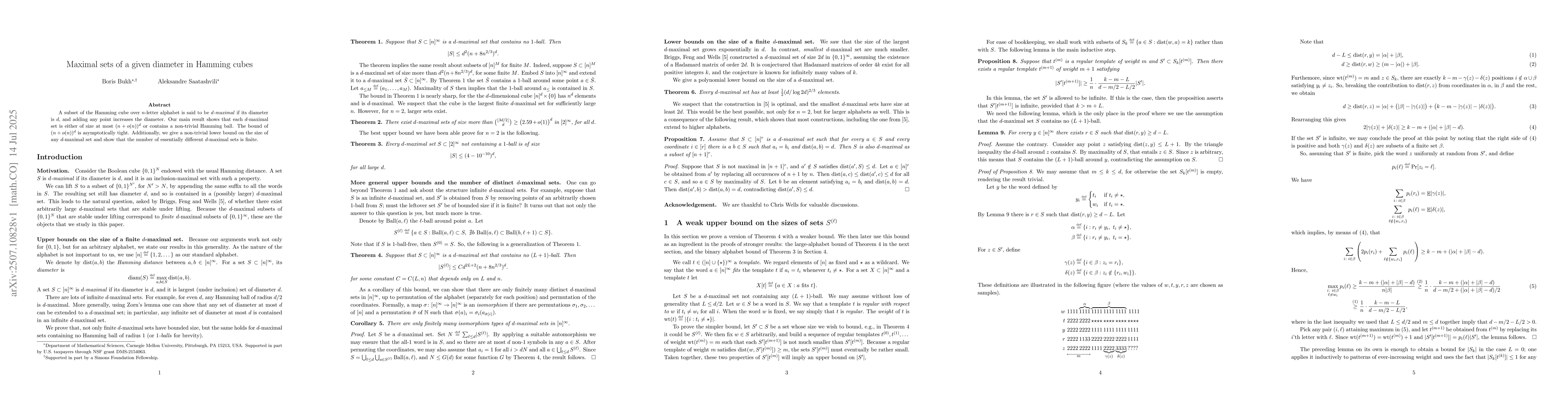 A subset of the Hamming cube over $n$-letter alphabet is said to be $d$-maximal if its diameter is $d$, and adding any point increases the diameter. Our main result shows that each $d$-maximal set is either of size at most $(n+o(n))^d$ or contains a non-trivial Hamming ball. The bound of $(n+o(n))^d$ is asymptotically tight. Additionally, we give a non-trivial lower bound on the size of any $d$-maximal set and show that the number of essentially different $d$-maximal sets is finite.