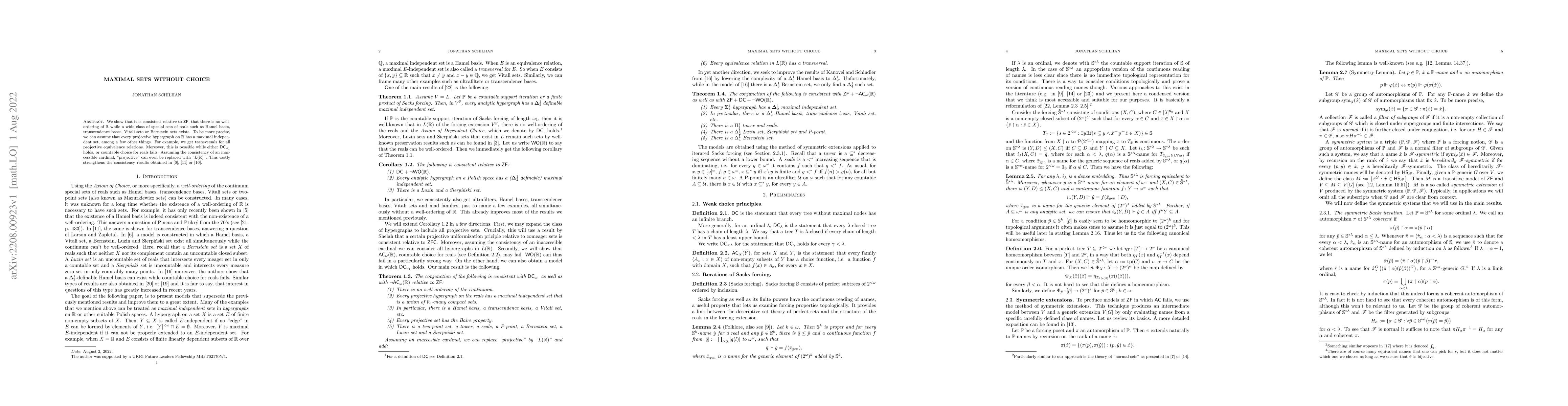 We show that it is consistent relative to ZF, that there is no well-ordering of $\mathbb{R}$ while a wide class of special sets of reals such as Hamel bases, transcendence bases, Vitali sets or Bernstein sets exists. To be more precise, we can assume that every projective hypergraph on $\mathbb{R}$ has a maximal independent set, among a few other things. For example, we get transversals for all projective equivalence relations. Moreover, this is possible while either $\mathsf{DC}_{\omega_1}$ holds, or countable choice for reals fails. Assuming the consistency of an inaccessible cardinal, "projective" can even be replaced with "$L(\mathbb{R})$". This vastly strengthens earlier consistency results in the literature.