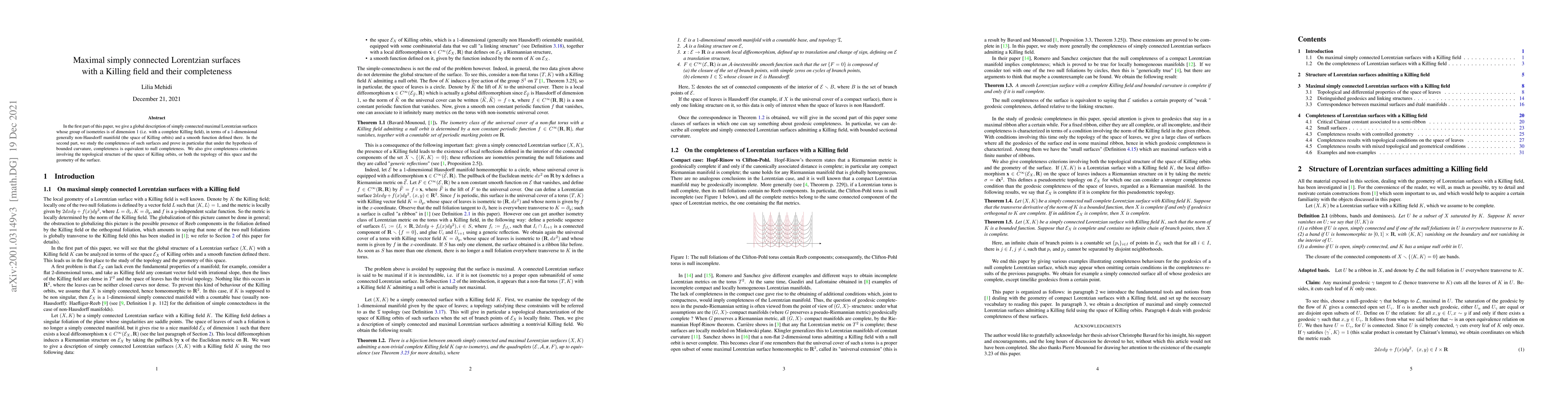 This paper describes simply connected maximal Lorentzian surfaces with a Killing field, linking their geometry to a 1-dimensional non-Hausdorff manifold. It also investigates their completeness, proving that under bounded curvature, completeness equals null completeness, and provides criteria based on the topology of the Killing orbits and surface geometry.