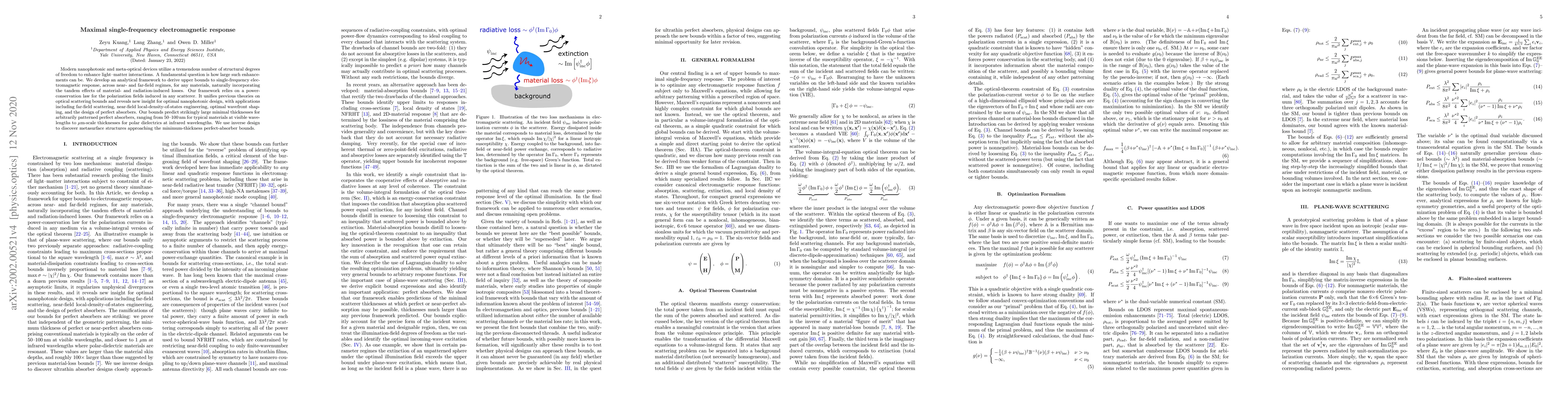 Modern nanophotonic and meta-optical devices utilize a tremendous number of structural degrees of freedom to enhance light--matter interactions. A fundamental question is how large such enhancements can be. We develop an analytical framework to derive upper bounds to single-frequency electromagnetic response, across near- and far-field regimes, for any materials, naturally incorporating the tandem effects of material- and radiation-induced losses. Our framework relies on a power-conservation law for the polarization fields induced in any scatterer. It unifies previous theories on optical scattering bounds and reveals new insight for optimal nanophotonic design, with applications including far-field scattering, near-field local-density-of-states engineering, optimal wavefront shaping, and the design of perfect absorbers. Our bounds predict strikingly large minimal thicknesses for arbitrarily patterned perfect absorbers, ranging from 50--100 nm for typical materials at visible wavelengths to micrometer-scale thicknesses for polar dielectrics at infrared wavelengths. We use inverse design to discover metasurface structures approaching the minimum-thickness perfect-absorber bounds.