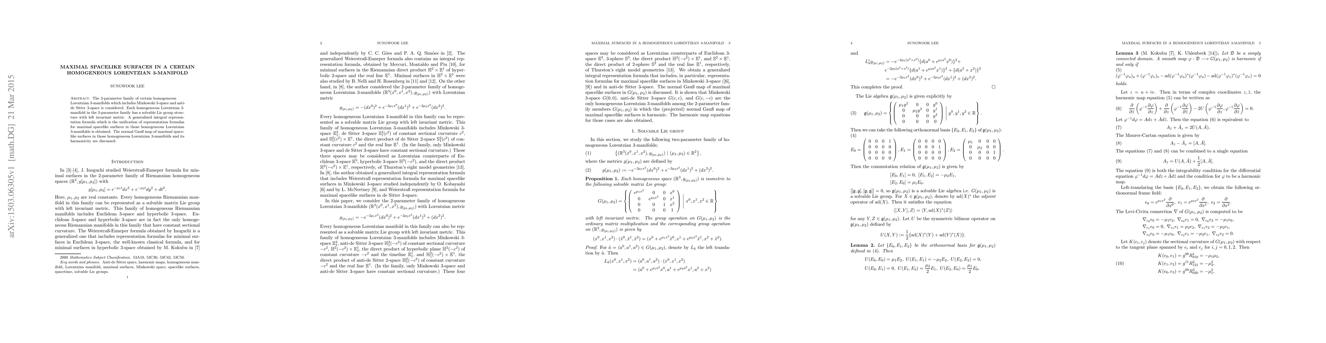 The paper presents a generalized integral representation formula for maximal spacelike surfaces in a 2-parameter family of homogeneous Lorentzian 3-manifolds, along with discussions on the harmonicity of the normal Gauss map and a Weierstrass-type representation for specific cases.