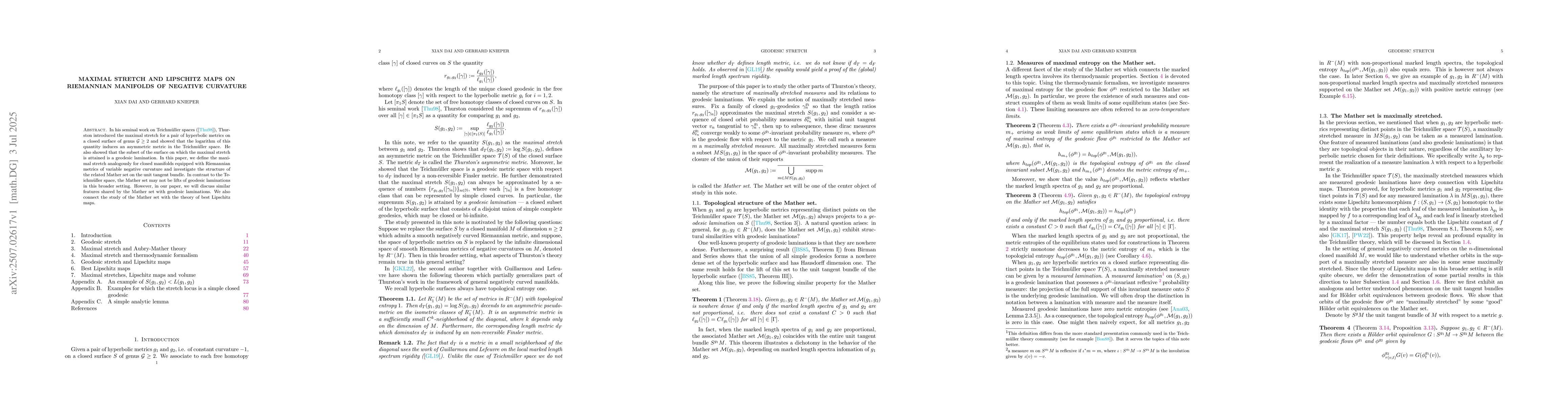 In his seminal work on Teichm\"uller spaces (\cite{Th98}), Thurston introduced the maximal stretch for a pair of hyperbolic metrics on a closed surface of genus $\geq 2$ and showed that the logarithm of this quantity induces an asymmetric metric in the Teichm\"uller space. He also showed that the subset of the surface on which the maximal stretch is attained is a geodesic lamination. In this paper, we define the maximal stretch analogously for closed manifolds equipped with Riemannian metrics of variable negative curvature and investigate the structure of the related Mather set on the unit tangent bundle. In contrast to the Teichm\"uller space, the Mather set may not be lifts of geodesic laminations in this broader setting. However, in our paper, we will discuss similar features shared by the Mather set with geodesic laminations. We also connect the study of the Mather set with the theory of best Lipschitz maps.