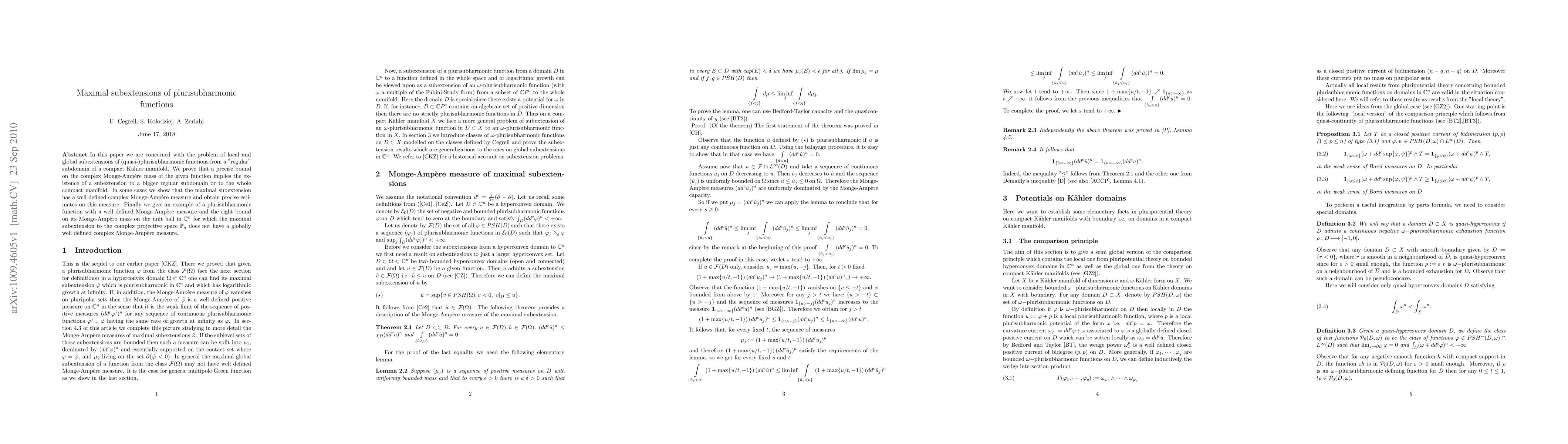 In this paper we are concerned with the problem of local and global subextensions of (quasi-)plurisubharmonic functions from a "regular" subdomain of a compact K\"ahler manifold. We prove that a precise bound on the complex Monge-Amp\`ere mass of the given function implies the existence of a subextension to a bigger regular subdomain or to the whole compact manifold. In some cases we show that the maximal subextension has a well defined complex Monge-Amp\`ere measure and obtain precise estimates on this measure. Finally we give an example of a plurisubharmonic function with a well defined Monge-Amp\`ere measure and the right bound on its Monge-Amp\`ere mass on the unit ball in $\C^n$ for which the maximal subextension to the complex projective space $\mb P_n$ does not have a globally well defined complex Monge-Amp\`ere measure.