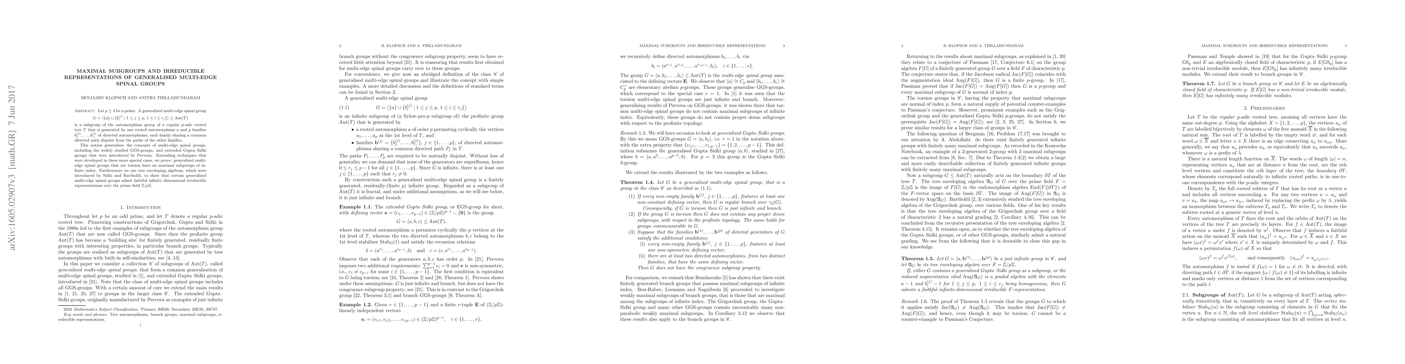 Let $p\ge 3$ be a prime. A generalised multi-edge spinal group is a subgroup of the automorphism group of a regular $p$-adic rooted tree T that is generated by one rooted automorphism and $p$ families of directed automorphisms, each family sharing a common directed path disjoint from the paths of the other families. This notion generalises the concepts of multi-edge spinal groups, including the widely studied GGS-groups, and the extended Gupta-Sidki groups that were introduced by Pervova. Extending techniques that were developed in these more special cases, we prove: generalised multi-edge spinal groups that are torsion have no maximal subgroups of infinite index. Furthermore we use tree enveloping algebras, which were introduced by Sidki and Bartholdi, to show that certain generalised multi-edge spinal groups admit faithful infinite dimensional irreducible representations over the prime field $\mathbb{Z}/p\mathbb{Z}$.