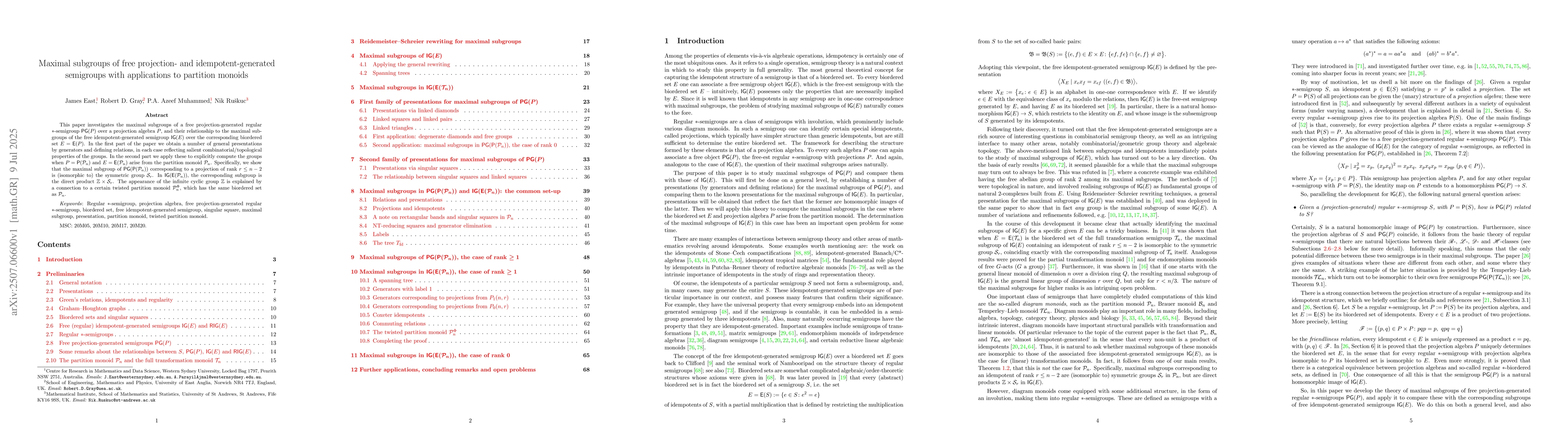 This paper investigates the maximal subgroups of a free projection-generated regular $*$-semigroup $PG(P)$ over a projection algebra $P$, and their relationship to the maximal subgroups of the free idempotent-generated semigroup $IG(E)$ over the corresponding biordered set $E = E(P)$. In the first part of the paper we obtain a number of general presentations by generators and defining relations, in each case reflecting salient combinatorial/topological properties of the groups. In the second part we apply these to explicitly compute the groups when $P = P(P_n)$ and $E = E(P_n)$ arise from the partition monoid $P_n$. Specifically, we show that the maximal subgroup of $PG(P(P_n))$ corresponding to a projection of rank $r\leq n-2$ is (isomorphic to) the symmetric group $S_r$. In $IG(E(P_n))$, the corresponding subgroup is the direct product $Z \times S_r$. The appearance of the infinite cyclic group $Z$ is explained by a connection to a certain twisted partition monoid $P_n^\Phi$, which has the same biordered set as $P_n$.