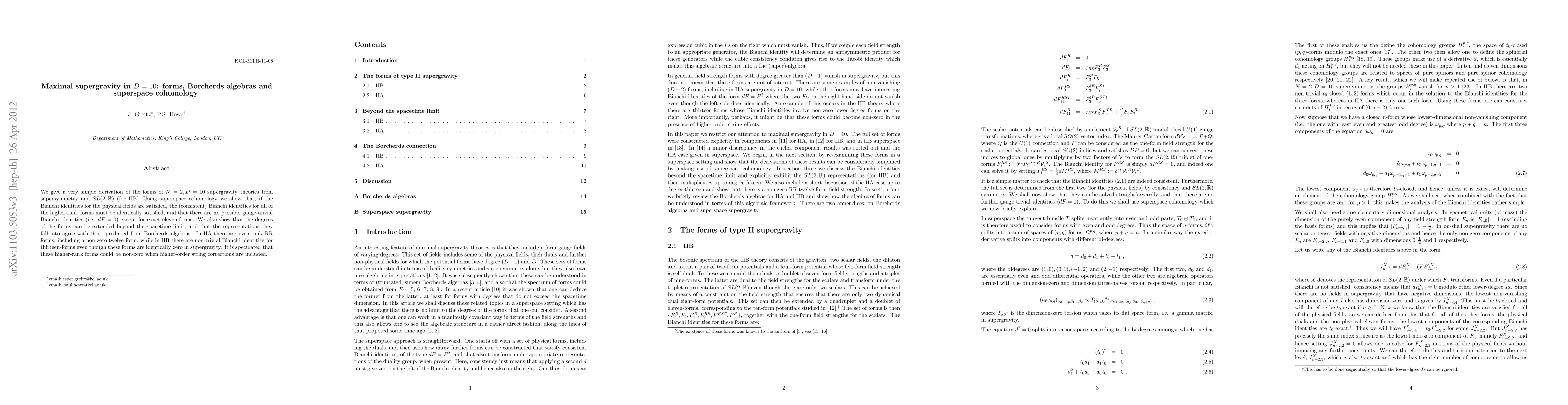 We give a very simple derivation of the forms of $N=2,D=10$ supergravity from supersymmetry and $SL(2,\bbR)$ (for IIB). Using superspace cohomology we show that, if the Bianchi identities for the physical fields are satisfied, the (consistent) Bianchi identities for all of the higher-rank forms must be identically satisfied, and that there are no possible gauge-trivial Bianchi identities ($dF=0$) except for exact eleven-forms. We also show that the degrees of the forms can be extended beyond the spacetime limit, and that the representations they fall into agree with those predicted from Borcherds algebras. In IIA there are even-rank RR forms, including a non-zero twelve-form, while in IIB there are non-trivial Bianchi identities for thirteen-forms even though these forms are identically zero in supergravity. It is speculated that these higher-rank forms could be non-zero when higher-order string corrections are included.