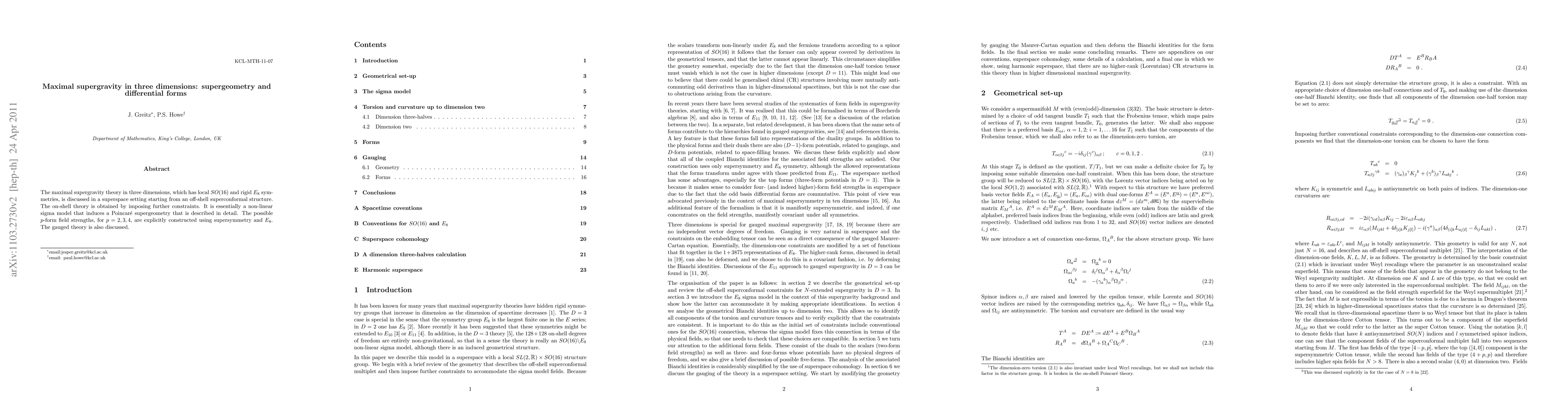 This paper explores the maximal supergravity theory in three dimensions, focusing on its supergeometry and differential forms. It constructs $p$-form field strengths for $p=2,3,4$ using supersymmetry and $E_8$ symmetries, and discusses the gauged version of the theory.