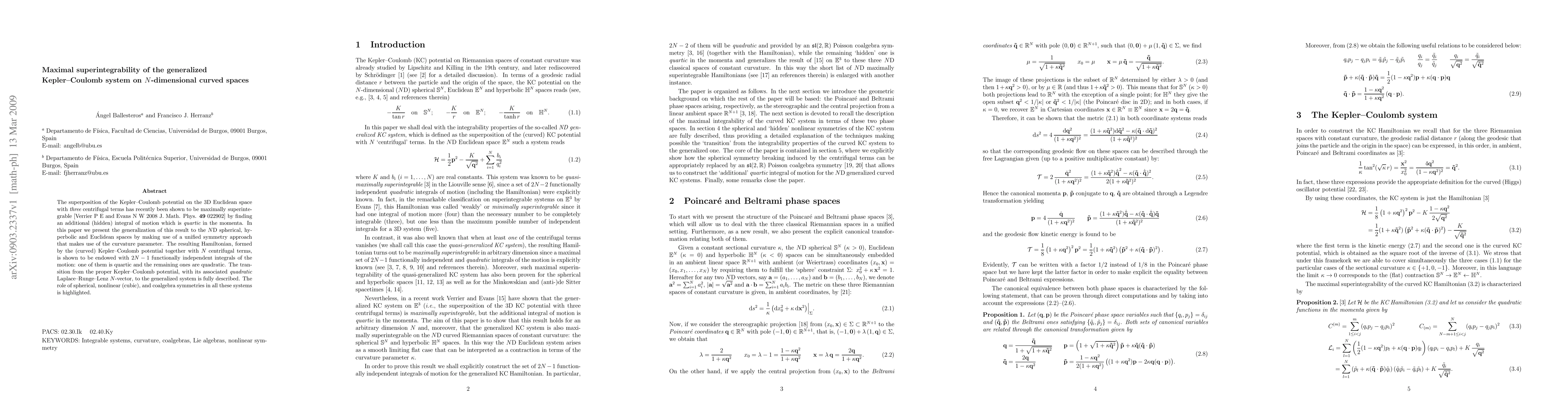 The superposition of the Kepler-Coulomb potential on the 3D Euclidean space with three centrifugal terms has recently been shown to be maximally superintegrable [Verrier P E and Evans N W 2008 J. Math. Phys. 49 022902] by finding an additional (hidden) integral of motion which is quartic in the momenta. In this paper we present the generalization of this result to the ND spherical, hyperbolic and Euclidean spaces by making use of a unified symmetry approach that makes use of the curvature parameter. The resulting Hamiltonian, formed by the (curved) Kepler-Coulomb potential together with N centrifugal terms, is shown to be endowed with (2N-1) functionally independent integrals of the motion: one of them is quartic and the remaining ones are quadratic. The transition from the proper Kepler-Coulomb potential, with its associated quadratic Laplace-Runge-Lenz N-vector, to the generalized system is fully described. The role of spherical, nonlinear (cubic), and coalgebra symmetries in all these systems is highlighted.