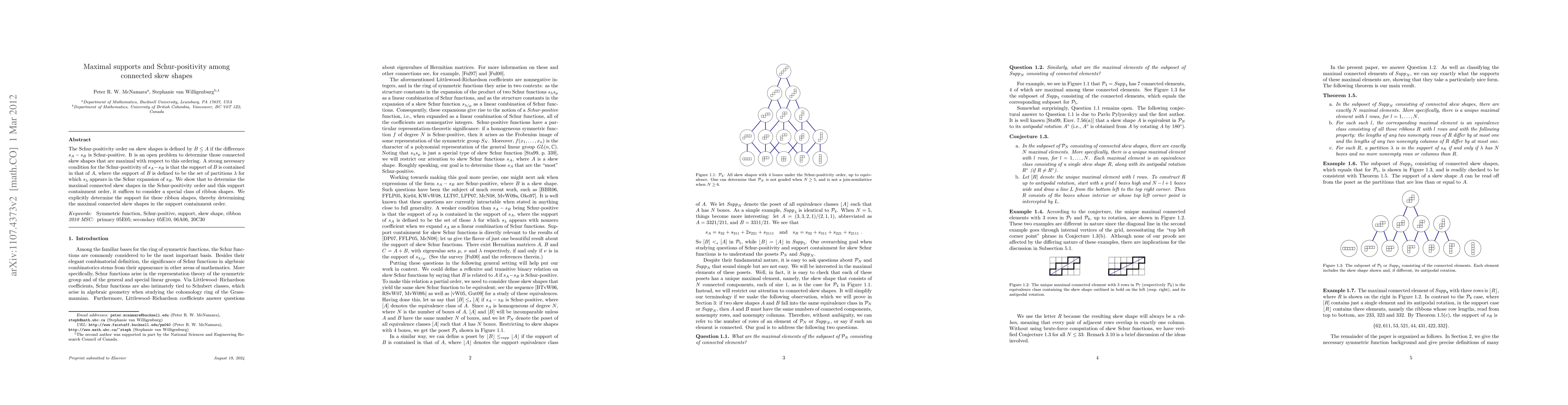 The Schur-positivity order on skew shapes is defined by B \leq A if the difference s_A - s_B is Schur-positive. It is an open problem to determine those connected skew shapes that are maximal with respect to this ordering. A strong necessary condition for the Schur-positivity of s_A - s_B is that the support of B is contained in that of A, where the support of B is defined to be the set of partitions lambda for which s_lambda appears in the Schur expansion of s_B. We show that to determine the maximal connected skew shapes in the Schur-positivity order and this support containment order, it suffices to consider a special class of ribbon shapes. We explicitly determine the support for these ribbon shapes, thereby determining the maximal connected skew shapes in the support containment order.