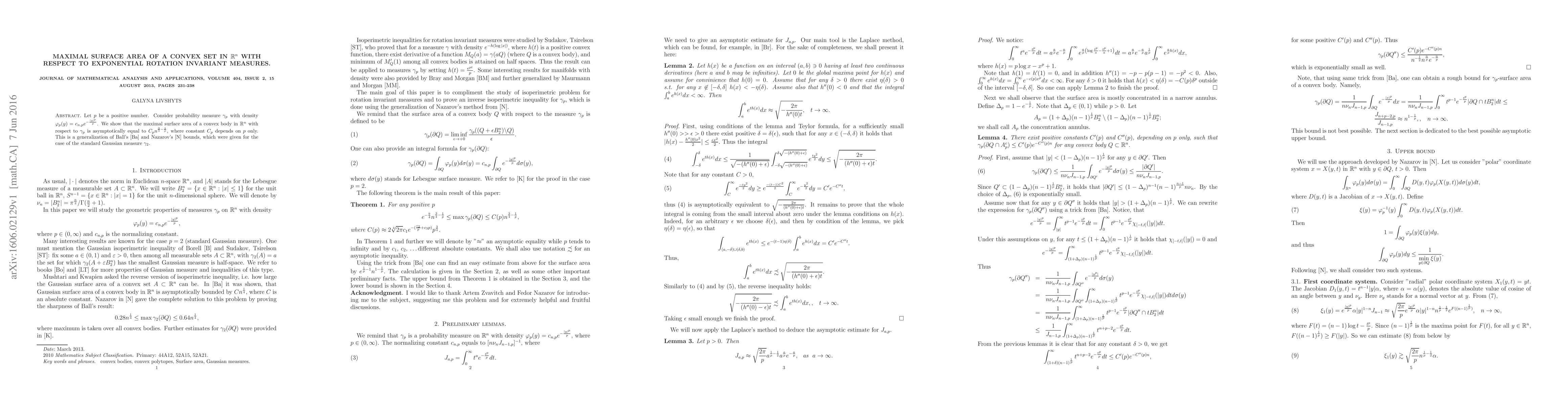 This paper investigates the maximal surface area of convex bodies in $\mathbb{R}^n$ under the exponential rotation invariant measure $\gamma_p$. It generalizes previous results by showing that the maximal surface area is asymptotically $C_p n^{\frac{3}{4}-\frac{1}{p}}$, where $C_p$ depends only on $p$.