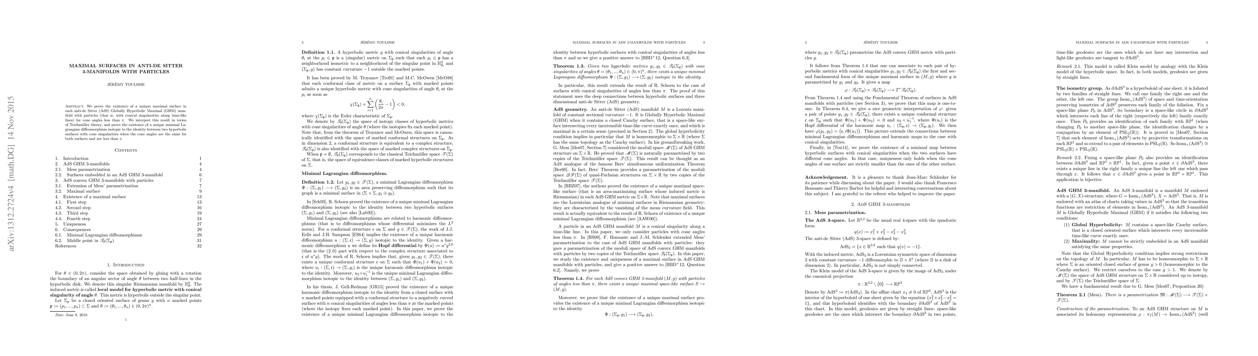 We prove the existence of a unique maximal surface in each anti-de Sitter (AdS) convex Globally Hyperbolic Maximal (GHM) manifold with particles (that is, with conical singularities along time-like lines) for cone angles less than $\pi$. We interpret this result in terms of Teichm\"uller theory, and prove the existence of a unique minimal Lagrangian diffeomorphism isotopic to the identity between two hyperbolic surfaces with cone singularities when the cone angles are the same for both surfaces and are less than $\pi$.