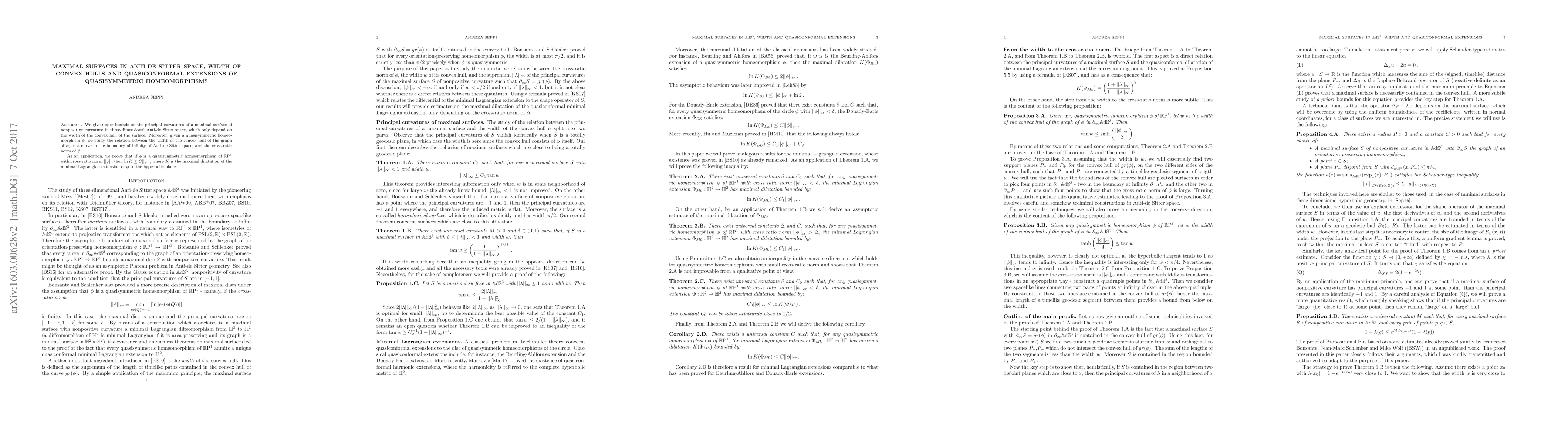 We give upper bounds on the principal curvatures of a maximal surface of nonpositive curvature in three-dimensional Anti-de Sitter space, which only depend on the width of the convex hull of the surface. Moreover, given a quasisymmetric homeomorphism $\phi$, we study the relation between the width of the convex hull of the graph of $\phi$, as a curve in the boundary of infinity of Anti-de Sitter space, and the cross-ratio norm of $\phi$. As an application, we prove that if $\phi$ is a quasisymmetric homeomorphism of $\mathbb{R}\mathrm{P}^1$ with cross-ratio norm $||\phi||$, then $\ln K\leq C||\phi||$, where $K$ is the maximal dilatation of the minimal Lagrangian extension of $\phi$ to the hyperbolic plane.