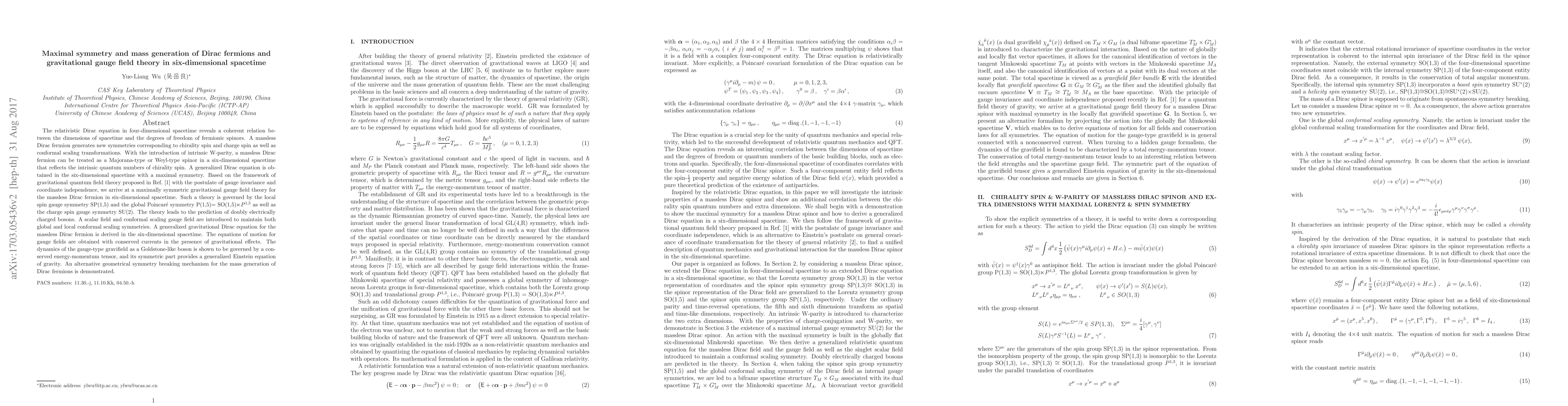 The relativistic Dirac equation in four-dimensional spacetime reveals a coherent relation between the dimensions of spacetime and the degrees of freedom of fermionic spinors. A massless Dirac fermion generates new symmetries corresponding to chirality spin and charge spin as well as conformal scaling transformations. With the introduction of intrinsic W-parity, a massless Dirac fermion can be treated as a Majorana-type or Weyl-type spinor in a six-dimensional spacetime that reflects the intrinsic quantum numbers of chirality spin. A generalized Dirac equation is obtained in the six-dimensional spacetime with a maximal symmetry. Based on the framework of gravitational quantum field theory proposed in Ref. \cite{YLWU} with the postulate of gauge invariance and coordinate independence, we arrive at a maximally symmetric gravitational gauge field theory for the massless Dirac fermion in six-dimensional spacetime. Such a theory is governed by the local spin gauge symmetry SP(1,5) and the global Poincar\'e symmetry P(1,5)= SO(1,5)$\ltimes P^{1,5} $ as well as the charge spin gauge symmetry SU(2). The theory leads to the prediction of doubly electrically charged bosons. A scalar field and conformal scaling gauge field are introduced to maintain both global and local conformal scaling symmetries. A generalized gravitational Dirac equation for the massless Dirac fermion is derived in the six-dimensional spacetime. The equations of motion for gauge fields are obtained with conserved currents in the presence of gravitational effects. The dynamics of the gauge-type gravifield as a Goldstone-like boson is shown to be governed by a conserved energy-momentum tensor, and its symmetric part provides a generalized Einstein equation of gravity. An alternative geometrical symmetry breaking mechanism for the mass generation of Dirac fermions is demonstrated.