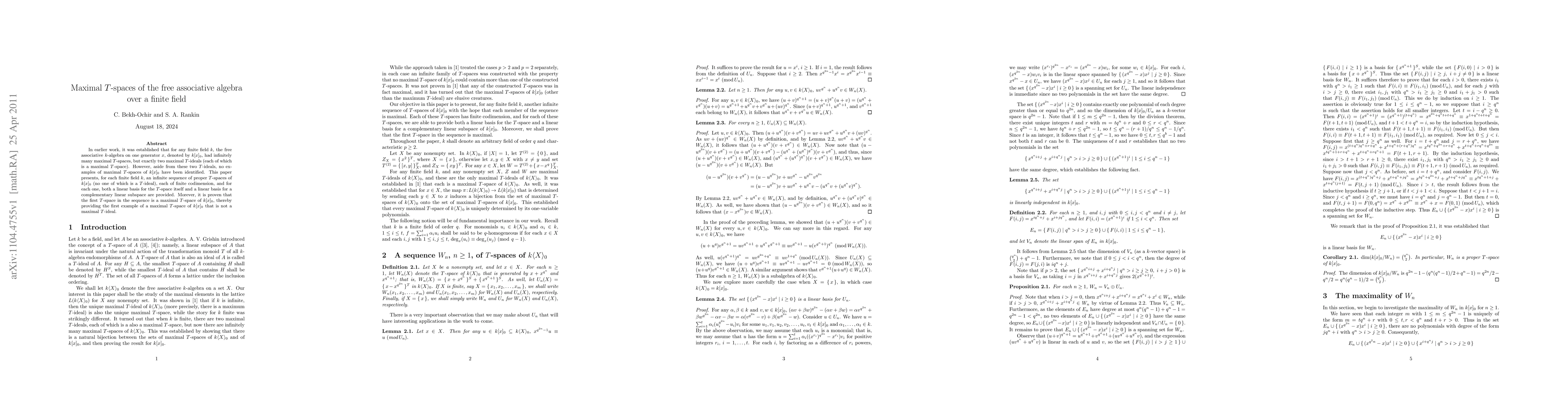 In earlier work, it was established that for any finite field k, the free associative k-algebra on one generator x, denoted by k[x]_0, had infinitely many maximal T-spaces, but exactly two maximal $ideals (each of which is a maximal T-space). However, aside from these two T-ideals, no examples of maximal T-spaces of k[c]_0 have been identified. This paper presents, for each finite field k, an infinite sequence of proper T-spaces of k[x]_0 (no one of which is a T-ideal), each of finite codimension, and for each one, both a linear basis for the T-space itself and a linear basis for a complementary linear subspace are provided. Morever, it is proven that the first T-space in the sequence is a maximal T-space of k[x]_0, thereby providing the first example of a maximal T-space of k[x]_0 that is not a maximal T-ideal.