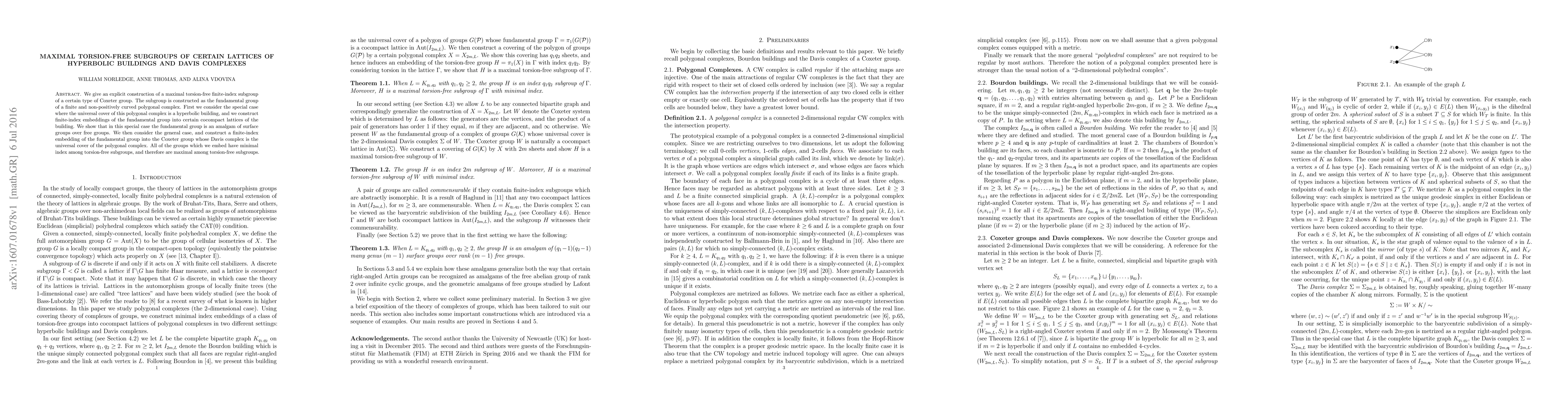Researchers constructed a maximal torsion-free finite-index subgroup of a Coxeter group using a polygonal complex with a hyperbolic building or Davis complex as its universal cover.