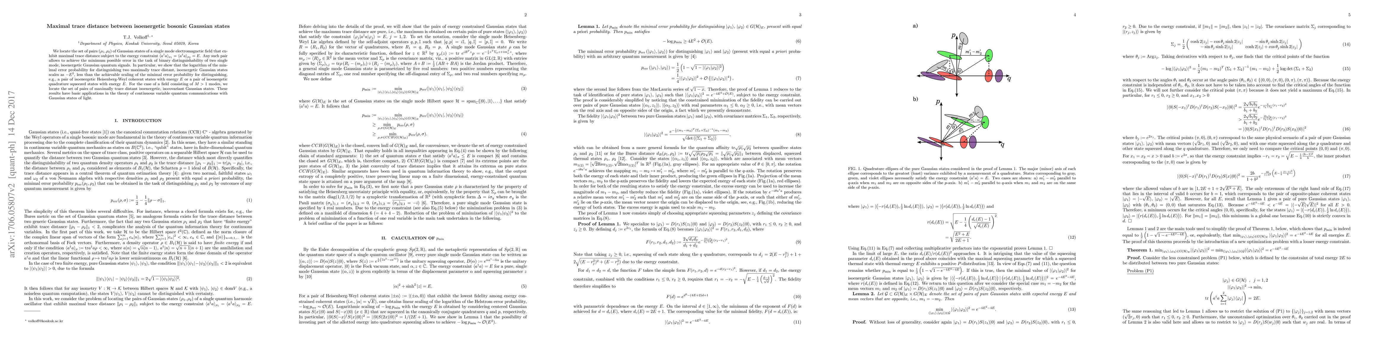 This paper identifies pairs of Gaussian states with equal energy that maximize trace distance, optimizing binary distinguishability in quantum communication. It demonstrates that the minimal error probability for distinguishing these states scales as $-E^{2}$, outperforming other quantum states under the same energy constraint.