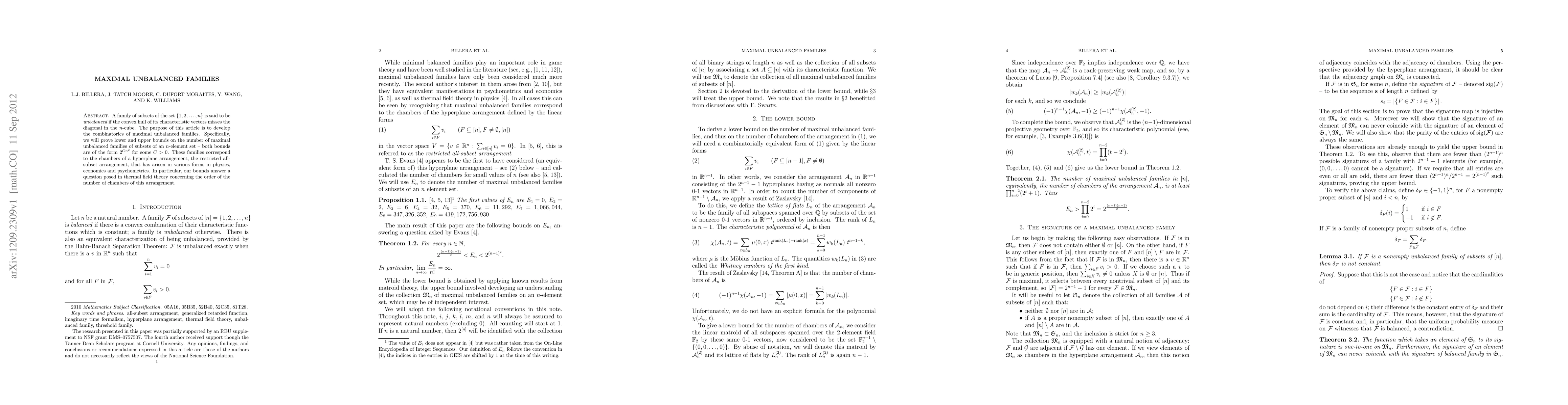 This paper explores the combinatorics of maximal unbalanced families of subsets, proving both lower and upper bounds of the form 2^{C n^2} for their count, where C > 0. These families relate to the chambers of a hyperplane arrangement significant in physics, economics, and psychometrics, addressing a question in thermal field theory.