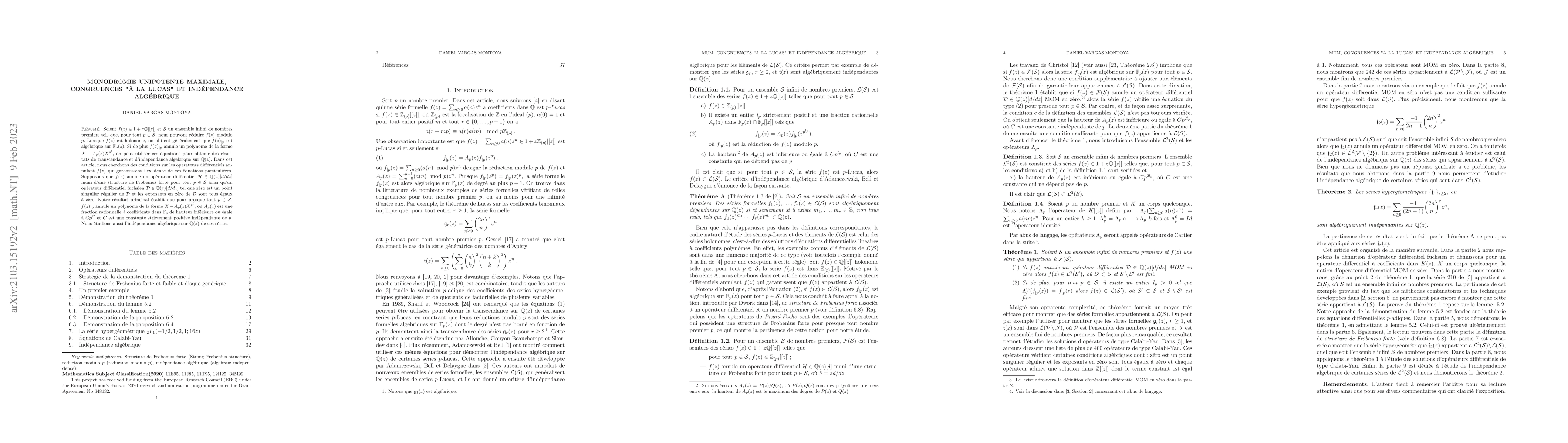 Let $f(z)$ be in $1+z\mathbb{Q}[[z]]$ and $\mathcal{S}$ be an infinite set of prime numbers such that, for all $p\in\mathcal{S}$, we can reduce $f(z)$ modulo $p$. We let $f(z)_{\mid p}$ denote the reduction of $f(z)$ modulo $p$. Generally, when $f(z)$ is D-finite, $f(z)_{\mid p}$ is algebraic over $\mathbb{F}_p(z)$. It turns out that if $f(z)$ is a solution of a polynomial of the form $X-A_p(z)X^{p^l}$, we can use this type of equations to obtain results of transcendence and algebraic independence over $\mathbb{Q}(z)$. In the present paper, we look for conditions on the differential operators annihilating $f(z)$ to guarantee the existence of these particular equations. Suppose that $f(z)$ is solution of a differential operator $\mathcal{H}\in\mathbb{Q}(z)[d/dz]$ having a strong Frobenius structure for all $p\in\mathcal{S}$ and we also suppose that $f(z)$ annihilates a Fuchsian differential operator $\mathcal{D}\in\mathbb{Q}(z)[d/dz]$ such that zero is a regular singular point of $\mathcal{D}$ and the exponents of $\mathcal{D}$ at zero are equal to zero. Our main result states that, for almost every prime $p\in\mathcal{S}$, $f(z)_{\mid p}$ is solution of a polynomial of the form $X-A_p(z)X^{p^l}$, where $A_p(z)$ is a rational function with coefficients in $\mathbb{F}_p$ of height less than or equal to $Cp^{2l}$ with $C$ a positive constant that does not depend on $p$. We also study the algebraic independence of these power series over $\mathbb{Q}(z)$.