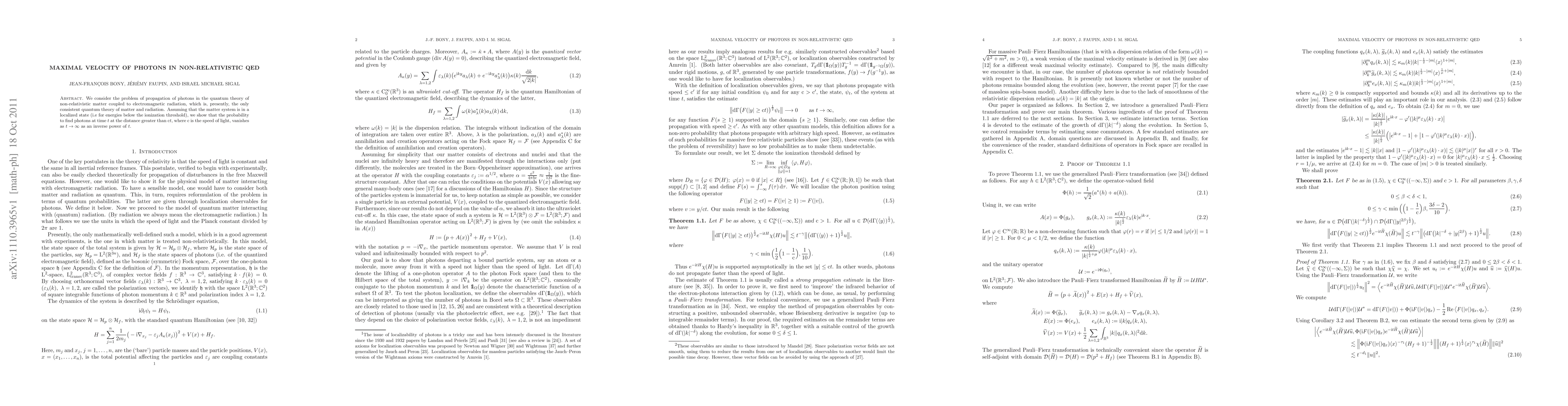We consider the problem of propagation of photons in the quantum theory of non-relativistic matter coupled to electromagnetic radiation, which is, presently, the only consistent quantum theory of matter and radiation. Assuming that the matter system is in a localized state (i.e for energies below the ionization threshold), we show that the probability to find photons at time t at the distance greater than ct, where c is the speed of light, vanishes as t goes to infinity as an inverse power of t.