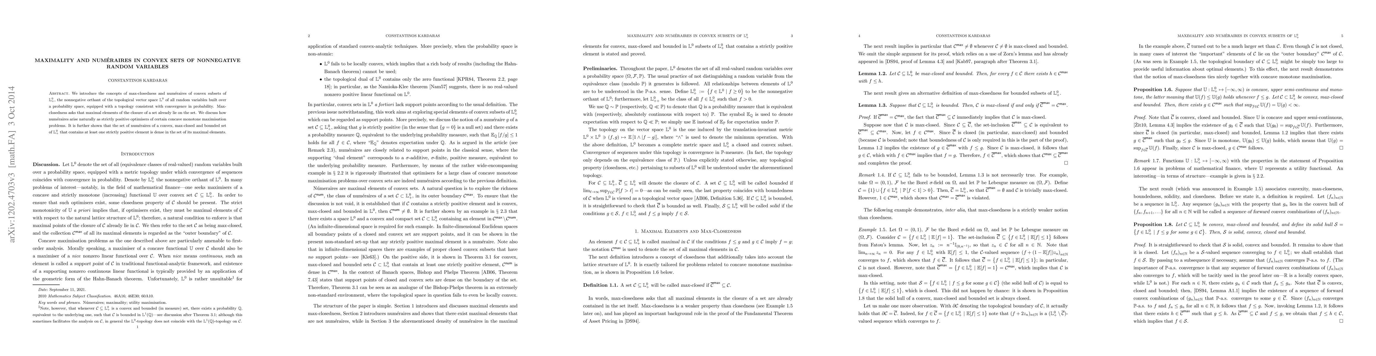 We introduce the concepts of max-closedness and numeraires of convex subsets in the nonnegative orthant of the topological vector space of all random variables built over a probability space, equipped with a topology consistent with convergence in probability. Max-closedness asks that maximal elements of the closure of a set already lie on the set. We discuss how numeraires arise naturally as strictly positive optimisers of certain concave monotone maximisation problems. It is further shown that the set of numeraires of a convex, max-closed and bounded set of of nonnegative random variables that contains at least one strictly positive element is dense in the set of its maximal elements.