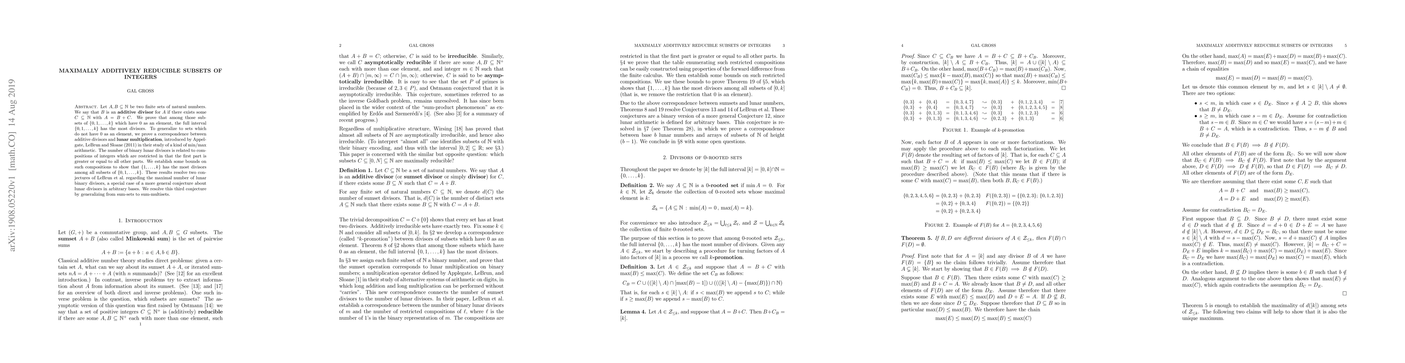 Let $A, B \subseteq \mathbb{N}$ be two finite sets of natural numbers. We say that $B$ is an additive divisor for $A$ if there exists some $C \subseteq \mathbb{N}$ with $A = B+C$. We prove that among those subsets of $\{0, 1, \ldots, k\}$ which have $0$ as an element, the full interval $\{0, 1, \ldots,k\}$ has the most divisors. To generalize to sets which do not have $0$ as an element, we prove a correspondence between additive divisors and lunar multiplication, introduced by Appelgate, LeBrun and Sloane (2011) in their study of a kind of min/max arithmetic. The number of binary lunar divisors is related to compositions of integers which are restricted in that the first part is greater or equal to all other parts. We establish some bounds on such compositions to show that $\{1, \ldots, k\}$ has the most divisors among all subsets of $\{0, 1, \ldots, k\}$. These results resolve two conjectures of LeBrun et al. regarding the maximal number of lunar binary divisors, a special case of a more general conjecture about lunar divisors in arbitrary bases. We resolve this third conjecture by generalizing from sum-sets to sum-multisets.