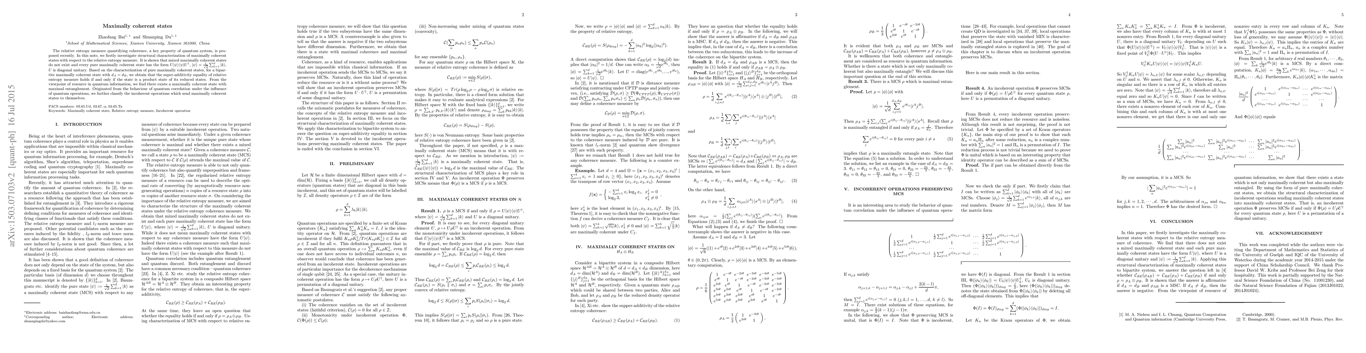 This paper investigates maximally coherent states (MCS) using a relative entropy measure, demonstrating that pure MCSs exist and are characterized by product states. It also reveals that MCSs with maximal entanglement can be found, and classifies incoherent operations preserving these states.