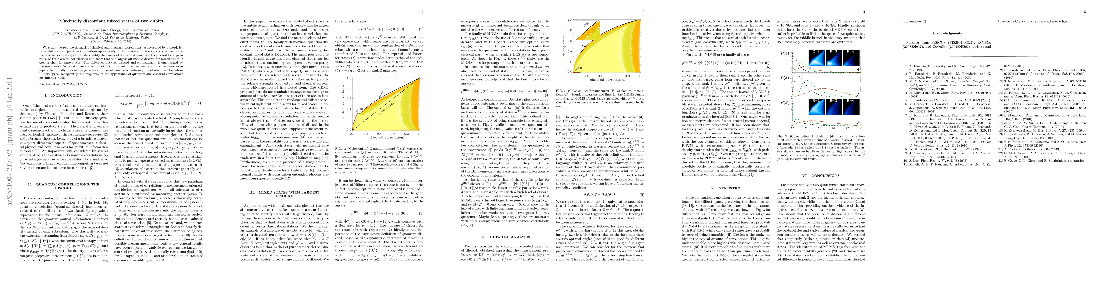 This paper explores the maximal discord in mixed two-qubit states, demonstrating that the largest discord occurs for mixed states despite not maximizing entanglement. It highlights the distinction between quantum and classical correlations and quantifies their occurrence frequency across different ranks.