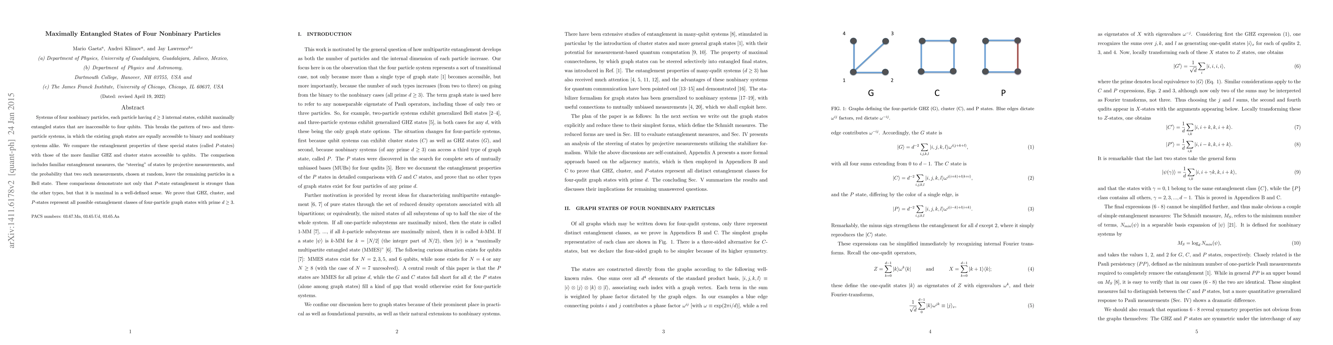 Systems of four nonbinary particles, each having three or more internal states, exhibit maximally entangled states that are inaccessible to four qubits. This breaks the pattern of two- and three-particle systems, in which the existing graph states are equally accessible to binary and nonbinary systems alike. We compare the entanglement properties of these special states (called P-states) with those of the more familiar GHZ and cluster states accessible to qubits. The comparison includes familiar entanglement measures, the "steering" of states by projective measurements, and the probability that two such measurements, chosen at random, leave the remaining particles in a Bell state. These comparisons demonstrate not only that P-state entanglement is stronger than the other types, but that it is maximal in a well-defined sense. We prove that GHZ, cluster, and P-states represent all possible entanglement classes of four-particle graph states with a prime number (>2) of states per particle.