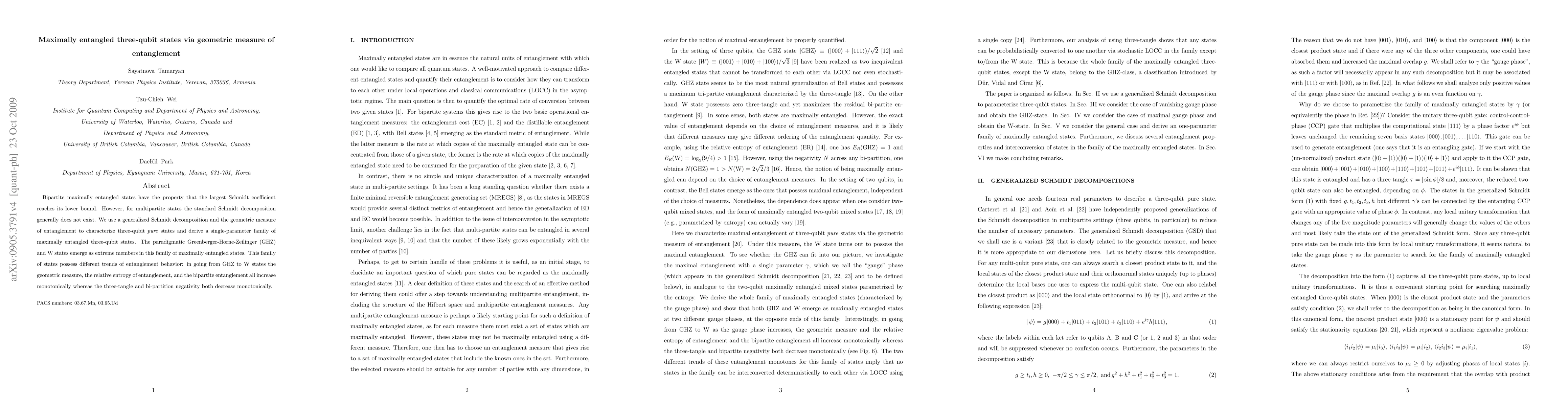 This paper presents a method to characterize maximally entangled three-qubit pure states using a generalized Schmidt decomposition and a geometric measure of entanglement, deriving a single-parameter family of such states including the GHZ and W states. The entanglement properties show contrasting trends between GHZ and W states.