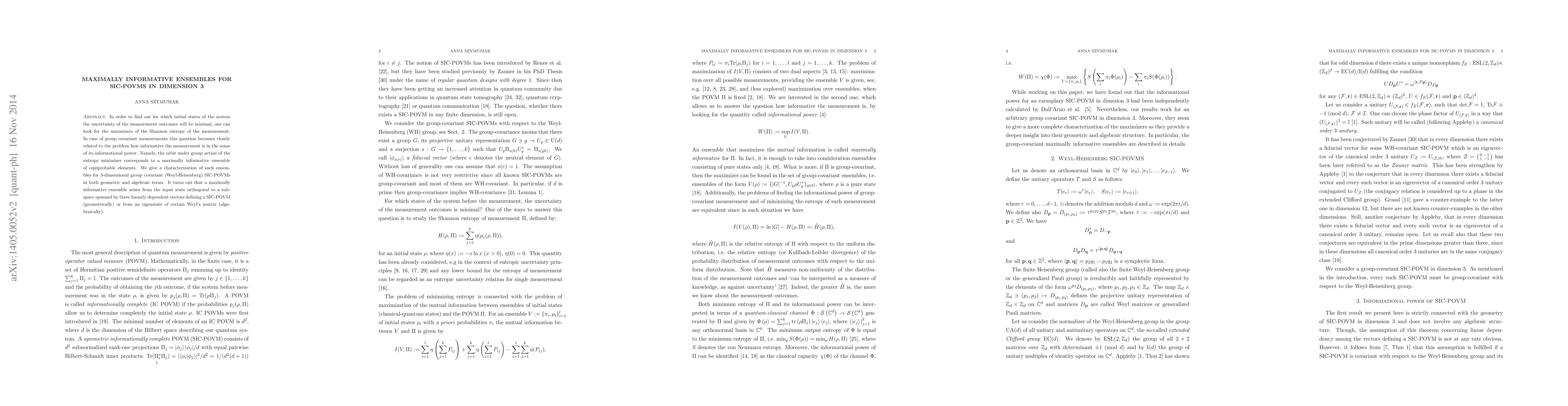 This paper characterizes maximally informative ensembles for 3-dimensional group covariant SIC-POVMs, showing that they arise from states orthogonal to a subspace defined by three linearly dependent vectors or from eigenstates of a specific Weyl's matrix. The focus is on minimizing measurement uncertainty and informational power.