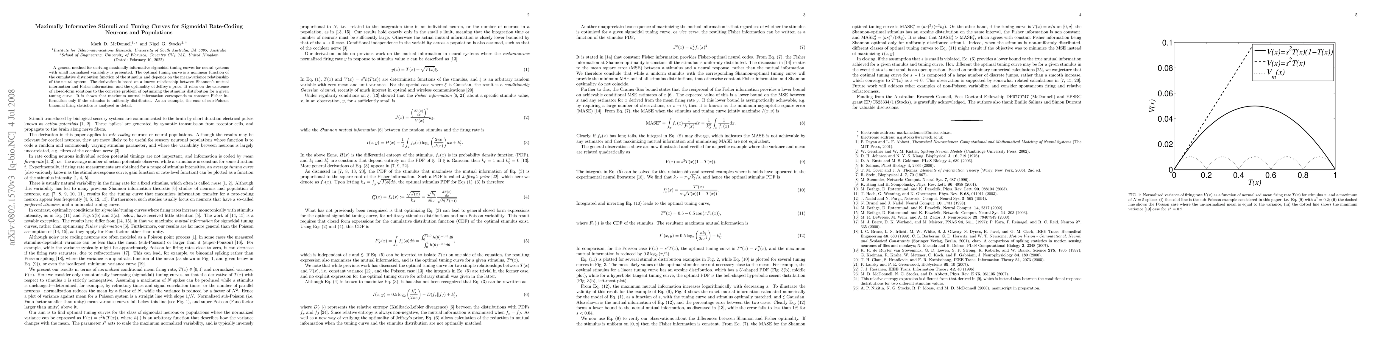 Researchers developed a method to create optimal sigmoidal tuning curves for neural systems, showing that maximum mutual information corresponds to constant Fisher information only when the stimulus is uniformly distributed.