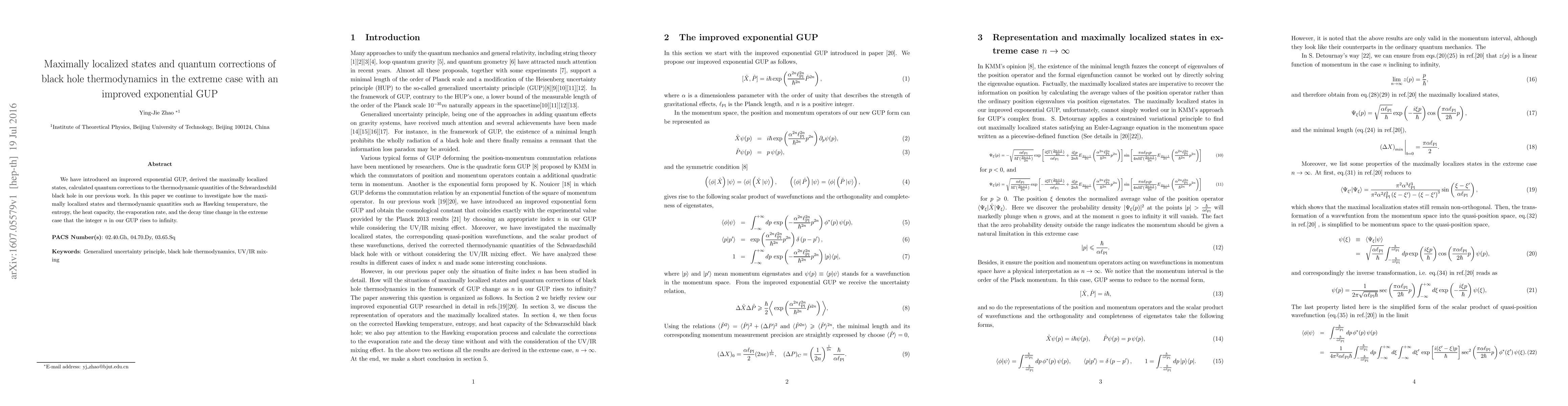 We have introduced an improved exponential GUP, derived the maximally localized states, calculated quantum corrections to the thermodynamic quantities of the Schwardzschild black hole in our previous work. In this paper we continue to investigate how the maximally localized states and thermodynamic quantities such as Hawking temperature, the entropy, the heat capacity, the evaporation rate, and the decay time change in the extreme case that the integer n in our GUP rises to infinity.