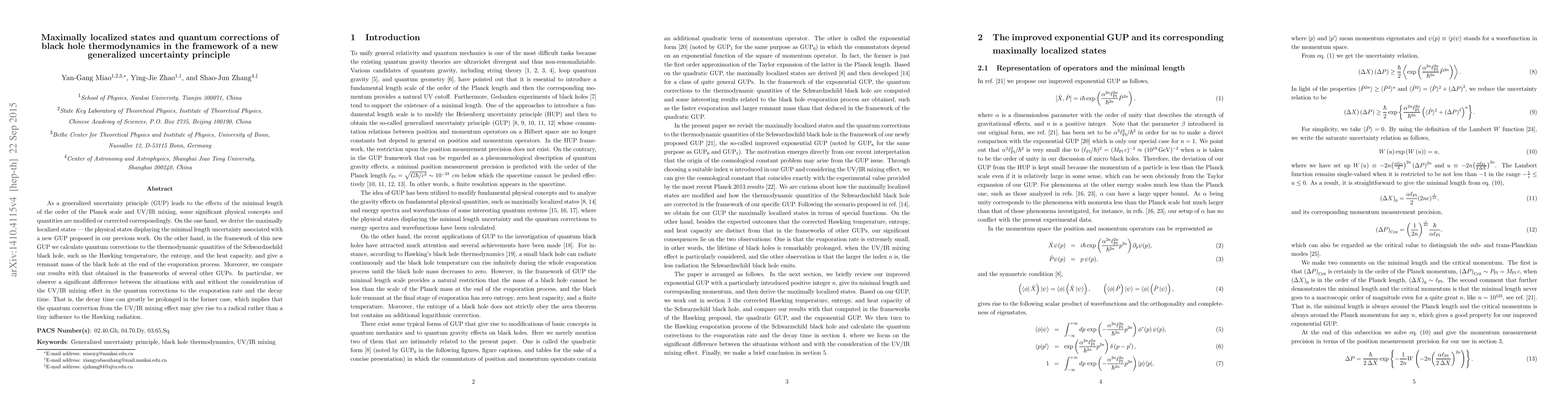 As a generalized uncertainty principle (GUP) leads to the effects of the minimal length of the order of the Planck scale and UV/IR mixing, some significant physical concepts and quantities are modified or corrected correspondingly. On the one hand, we derive the maximally localized states --- the physical states displaying the minimal length uncertainty associated with a new GUP proposed in our previous work. On the other hand, in the framework of this new GUP we calculate quantum corrections to the thermodynamic quantities of the Schwardzschild black hole, such as the Hawking temperature, the entropy, and the heat capacity, and give a remnant mass of the black hole at the end of the evaporation process. Moreover, we compare our results with that obtained in the frameworks of several other GUPs. In particular, we observe a significant difference between the situations with and without the consideration of the UV/IR mixing effect in the quantum corrections to the evaporation rate and the decay time. That is, the decay time can greatly be prolonged in the former case, which implies that the quantum correction from the UV/IR mixing effect may give rise to a radical rather than a tiny influence to the Hawking radiation.